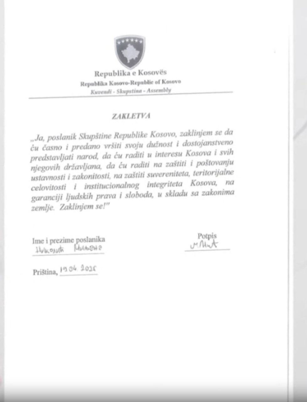 Me nënshkrimin e vënë nën tekstin e shkruar në gjuhen serbe, nëntë deputetët e rinj të Listës Serbe, janë deklaruar si ligjvënës të Republikës dhe janë zotuar se do të punojnë në interes të shtetit të Kosovës dhe të ruajtjes së sovranitetit dhe integritetit territorial të saj.