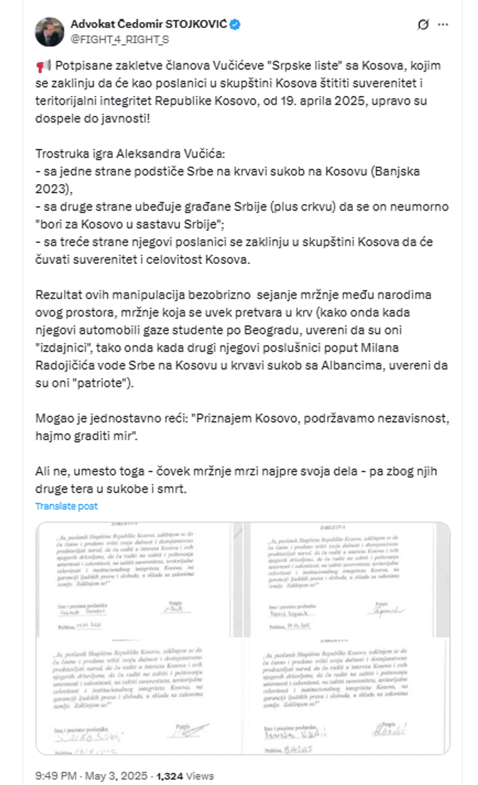 Kjo lojë e dyfishtë, madje trefishtë, ka prodhuar vetëm urrejtje, manipulim dhe përplasje të dhunshme – duke nxitur përçarje ndërmjet komuniteteve dhe viktima të pafajshme, në një kohë kur paqja mund të ishte zgjedhja më e thjeshtë dhe më e drejtë”, ka shkruar avokati serb.