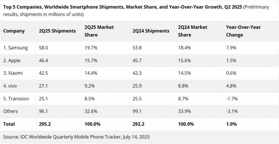 Megjithatë, Samsung mbeti në krye me 58 milionë njësi të shitura dhe një pjesë tregu prej 19.7%.