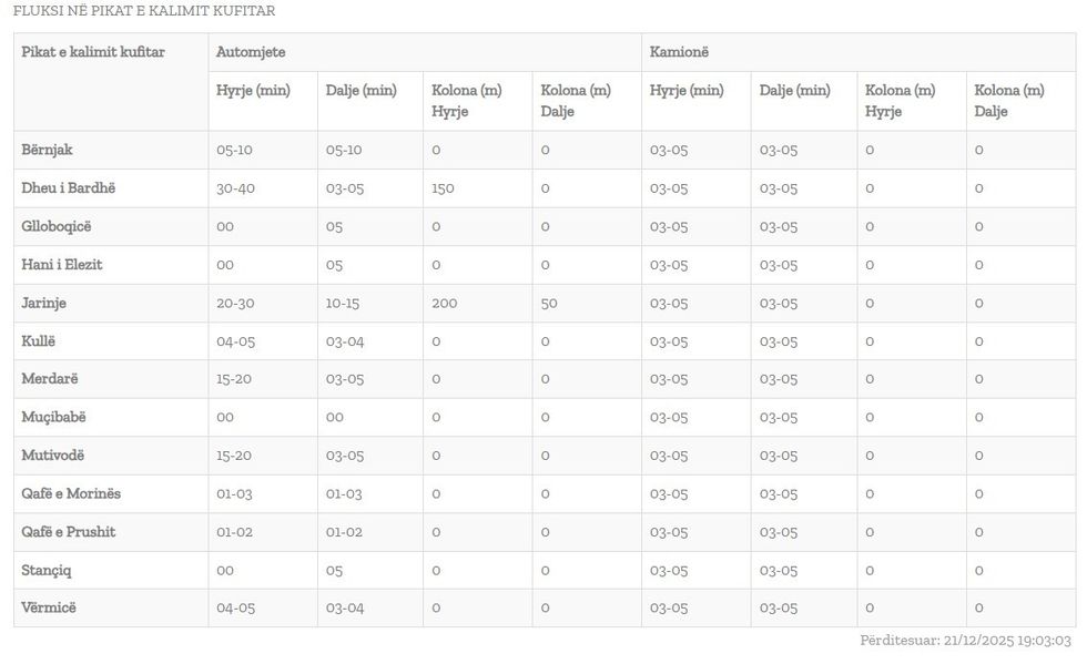 Qendra Kombëtare për Menaxhim Kufitar ka publikuar të dhënat e përditësuara lidhur me gjendjen dhe pritjet në pikat e kalimit kufitar, sipas përditësimit të bërë më 21 dhjetor 2025, në ora 19:03.