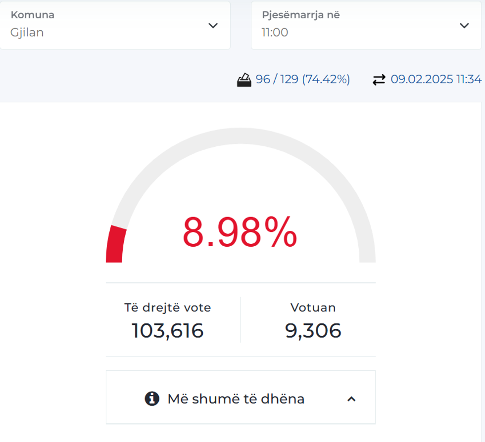 Në Komunën e Gjilanit deri në ora 11:00, nga 103 mijë e 616 qytetarë me të drejtë vote, kanë votuar 9306, apo 8.98 përqind.