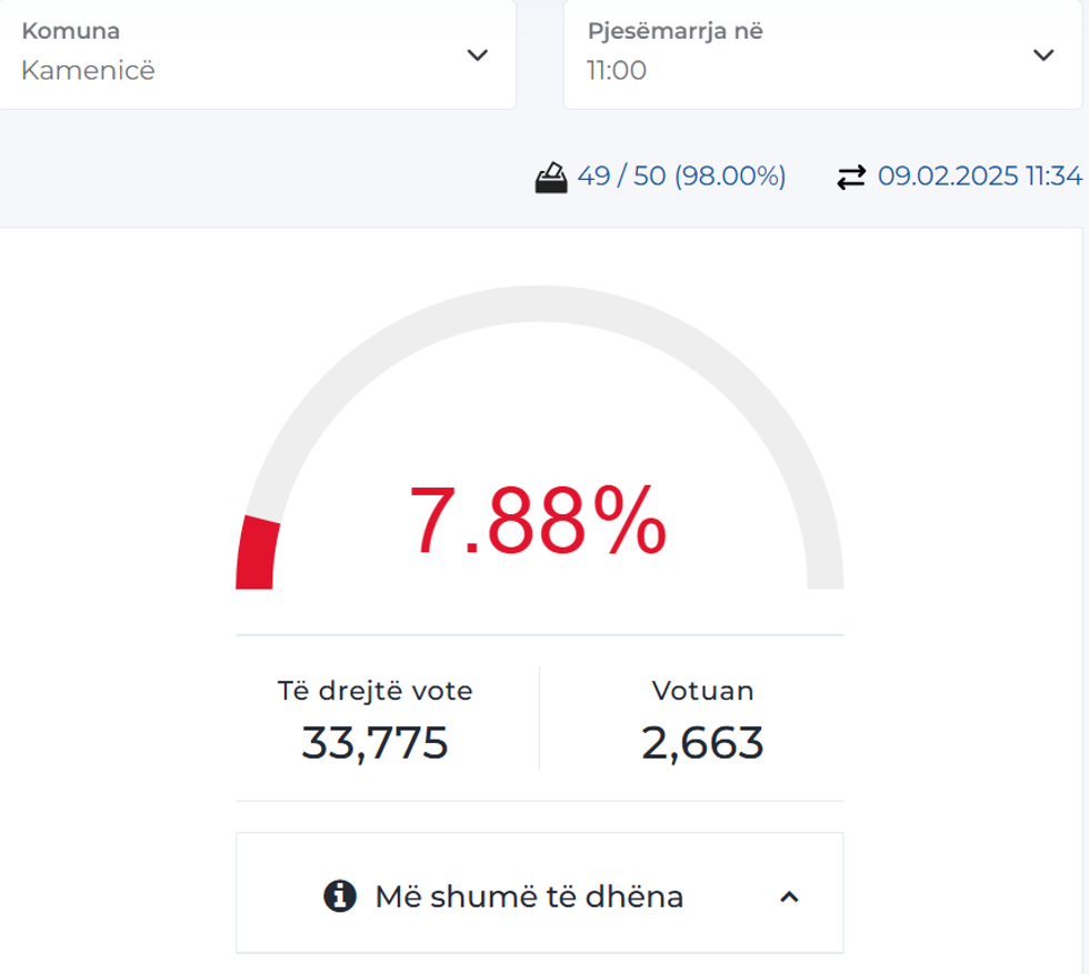 Ndërsa, në Komunën e Kamenicës kanë votuar 2663 qytetarë nga 33 mijë e 775 sa kanë të drejtë vote. Deri në ora 11:00 është regjistruar 7.88 përqind e votuesve në këtë komunë.