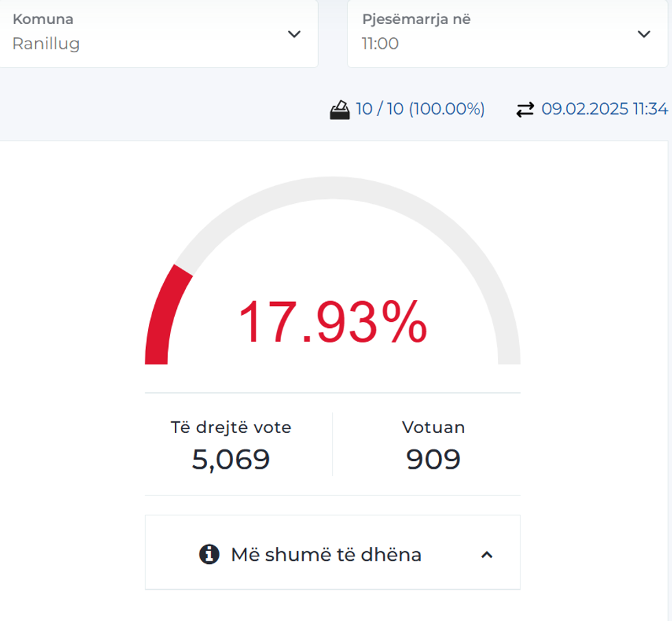 Në Komunën e Ranillugut nga 5069 votues, deri në ora 11:00 kanë votuar 909 qytetarë, apo 17.93 përqind.