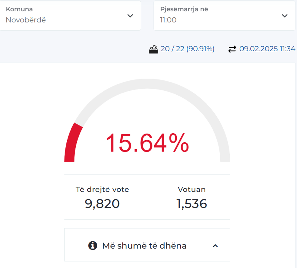 Në Komunën e Novobërdës nga 9820 votues, deri në ora 11:00 kanë votuar 1536 qytetarë, apo 15.64 përqind. /Telegrafi/
