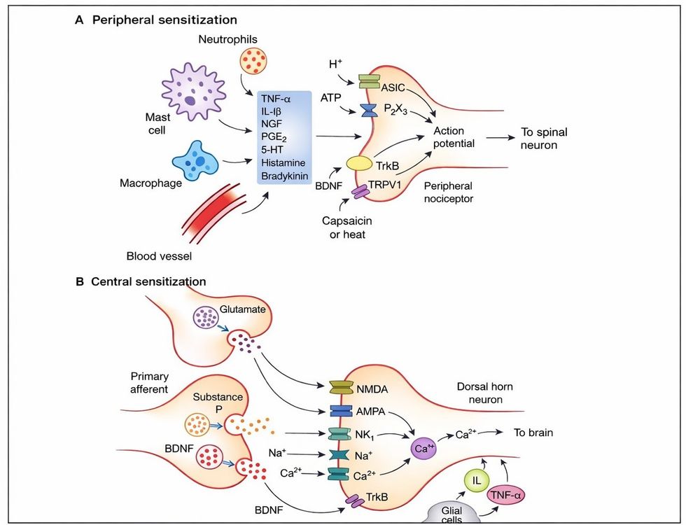 Dhimbja e shpinës përfshin ndërveprime të ndërlikuara midis nervave periferikë dhe rrjeteve qendrore të trurit. Në nivel periferik, fibrat nervore që përpunojnë stimulimin dhimbës reagojnë më fuqishëm ndaj traumës apo inflamacionit, duke rritur ndjeshmërinë ndaj stimujve normalë. Në nivel qendror, ka rritje të sinjalizimit që ngjitet drejt trurit dhe reduktim të efektivitetit të mekanizmave inhibitorë që normalisht modifikojnë dhimbjen. Kjo kombinim i sensibilizimit periferik dhe qendror mund të çojë në përjetimin e dhimbjes edhe gjatë stimujve jo-dhimbësorë.