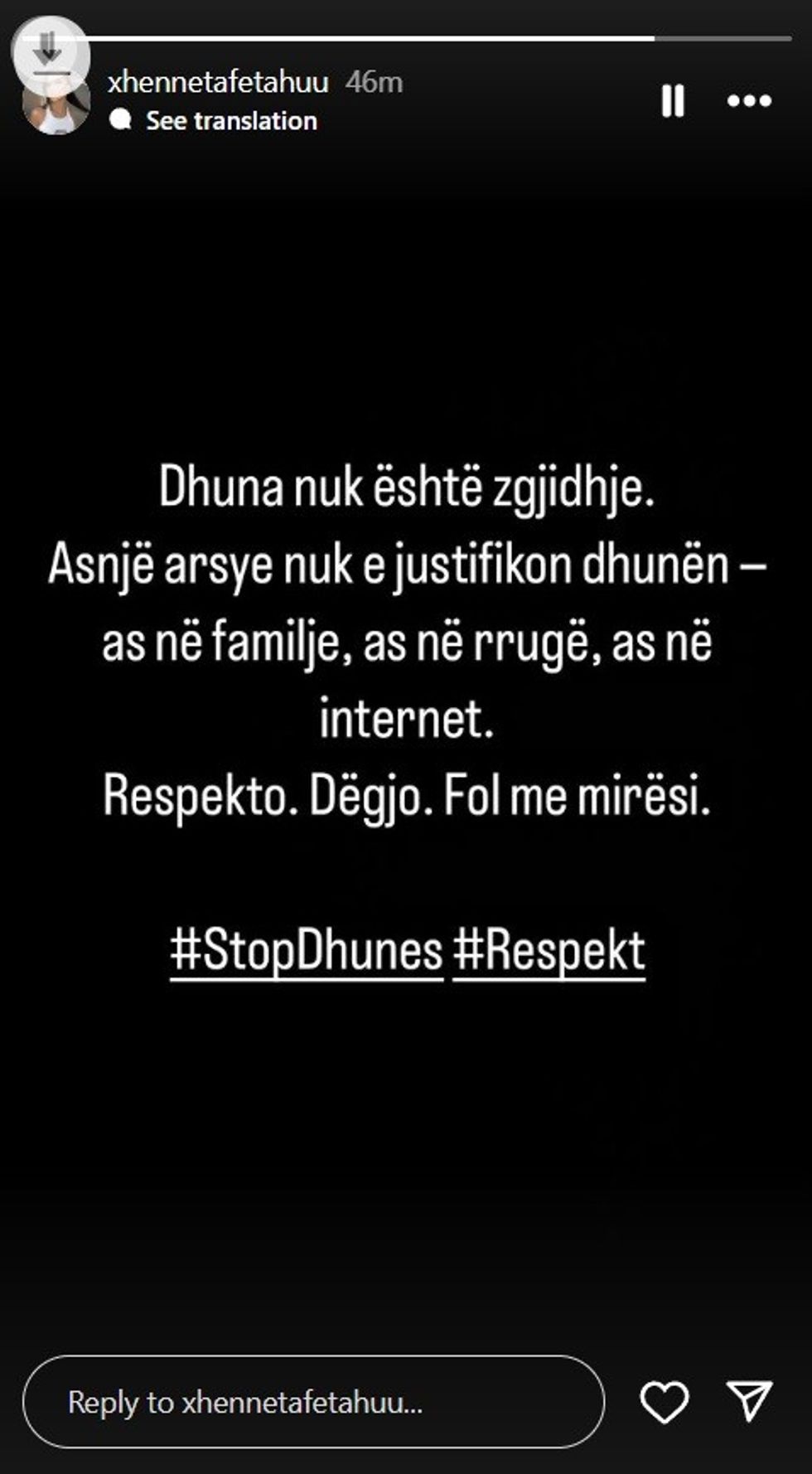 Në lidhje me këtë incident ka reaguar edhe Xheneta, ish e dashura e Gjestit gjatë qëndrimit të tyre në “BBVK”. Përmes një postimi në rrjetet sociale, ajo theksoi se dhuna nuk mund të justifikohet në asnjë rrethanë.