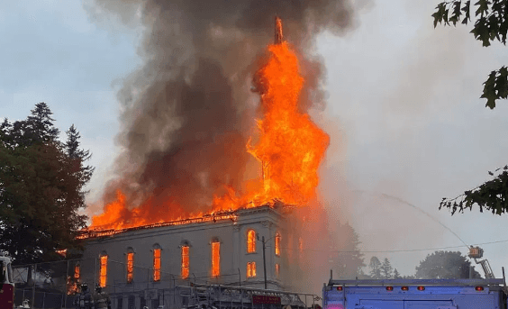 Flakët shpërthyen në anët e kambanës së kishës së lashtë dhe u përhapën shpejt në katin e parë të saj përpara se zjarri i furishëm të kaploi tërë tempullin e adhurimit.