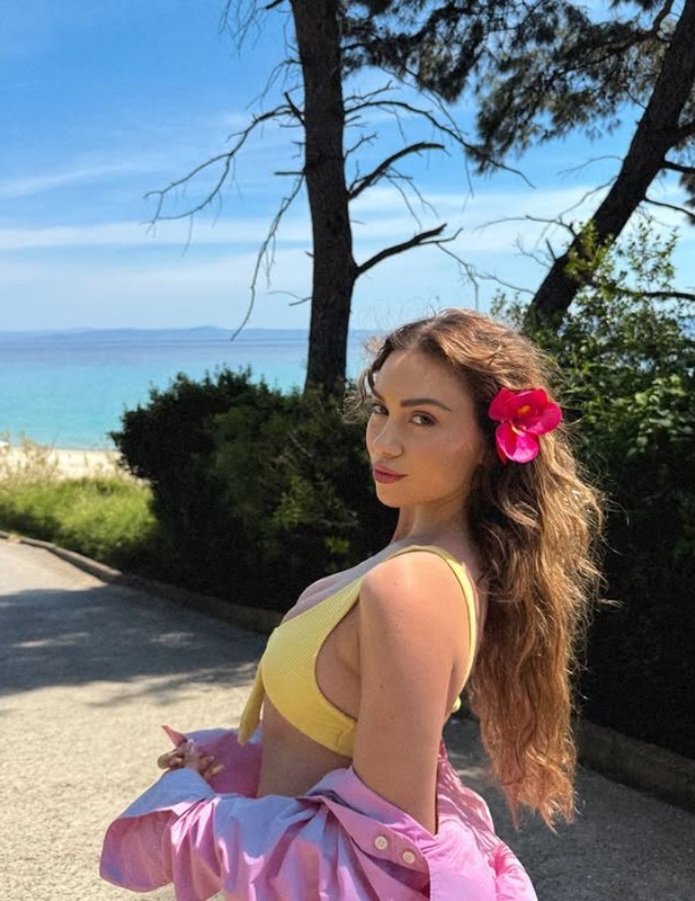 Me flokët e lëshuar valë-valë, një lule rozë në flokë dhe syzet me stil modern, Diona ka sjellë një atmosferë tropikale që të çon menjëherë me mendje te pushimet verore.