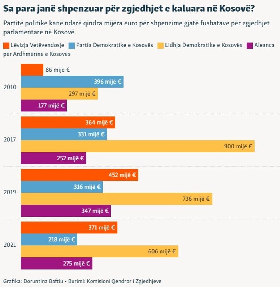 Në vitin 2021, kur në Kosovë u mbajtën dy palë zgjedhje - të parakohshme parlamentare dhe lokale - katër partitë më të mëdha politike, Lëvizja Vetëvendosje, Partia Demokratike e Kosovës, Lidhja Demokratike e Kosovës dhe Aleanca për Ardhmërinë e Kosovës, shpenzuan mbi 2.7 milionë euro.