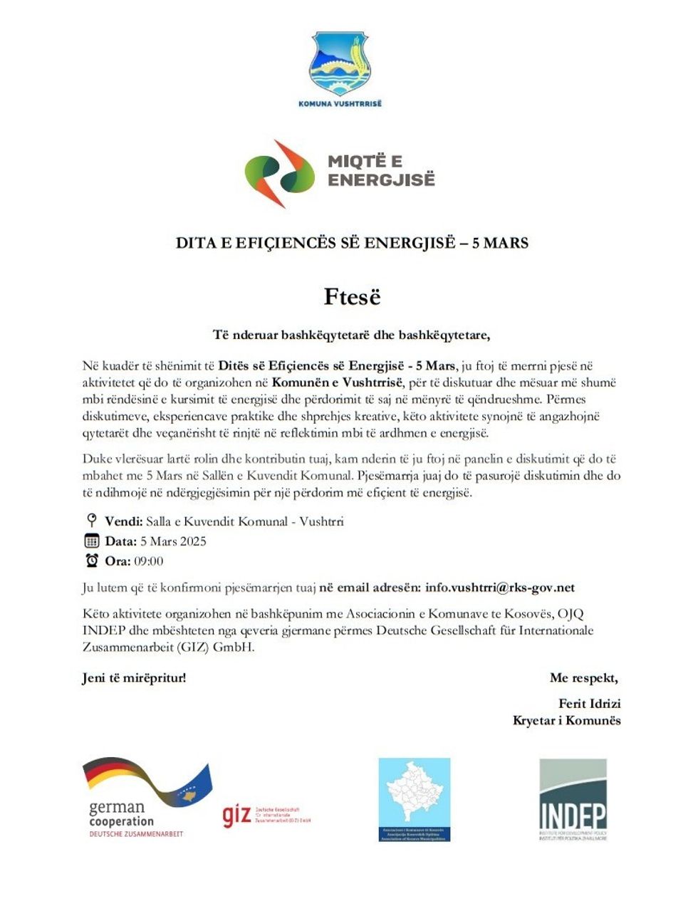 Në kuadër të shënimit të Ditës së Efiçiencës së Energjisë më 5 mars, Komuna e Vushtrrisë do të organizojë një panel diskutimi mbi rëndësinë e kursimit të energjisë elektrike.