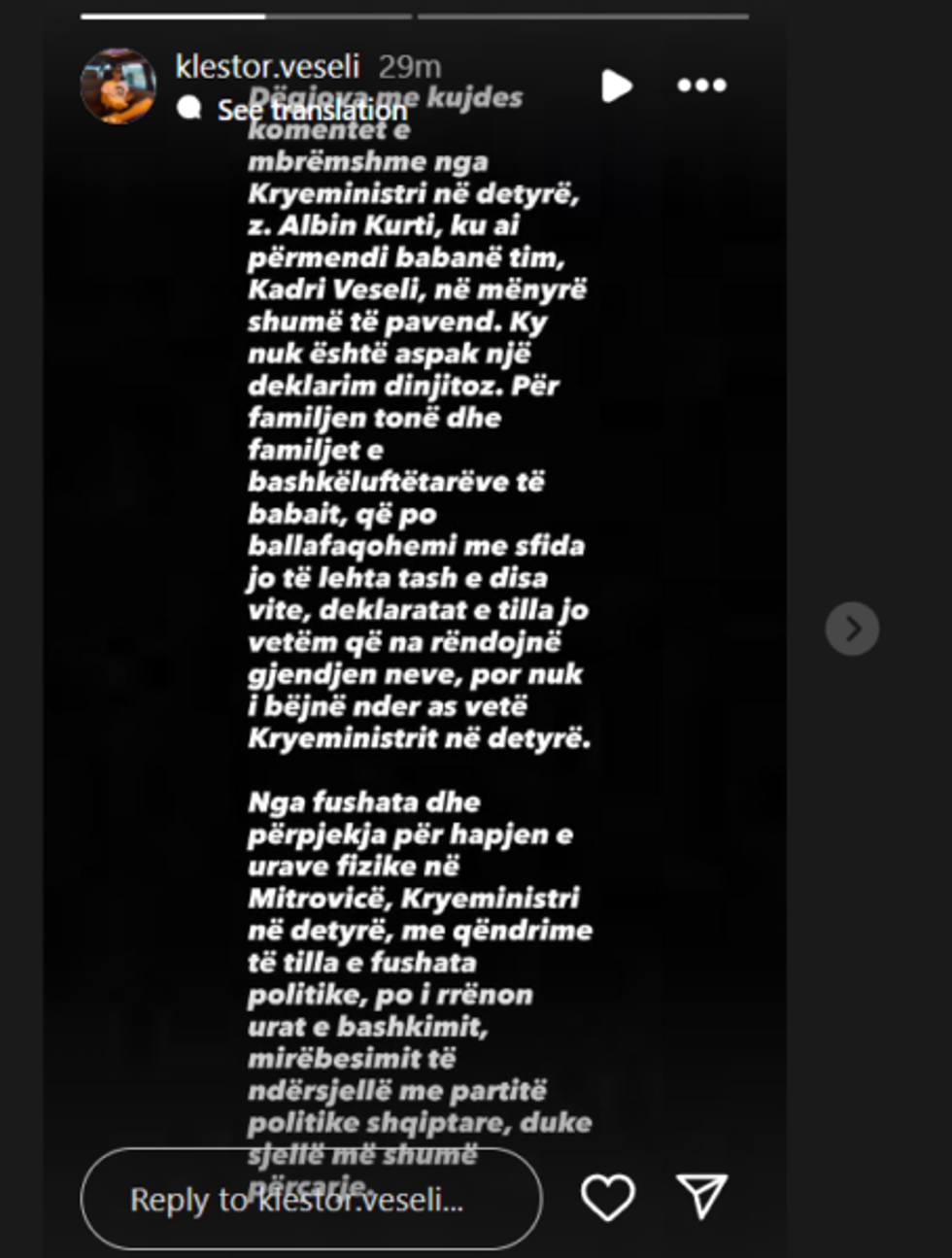 Djali i ish-kryetarit të Kuvendit të Kosovës dhe njërit prej liderëve historikë të UÇK-së, Kadri Veselit, Klestori Veseli, i është përgjigjur kryeministrit në detyrë, Albin Kurti.
