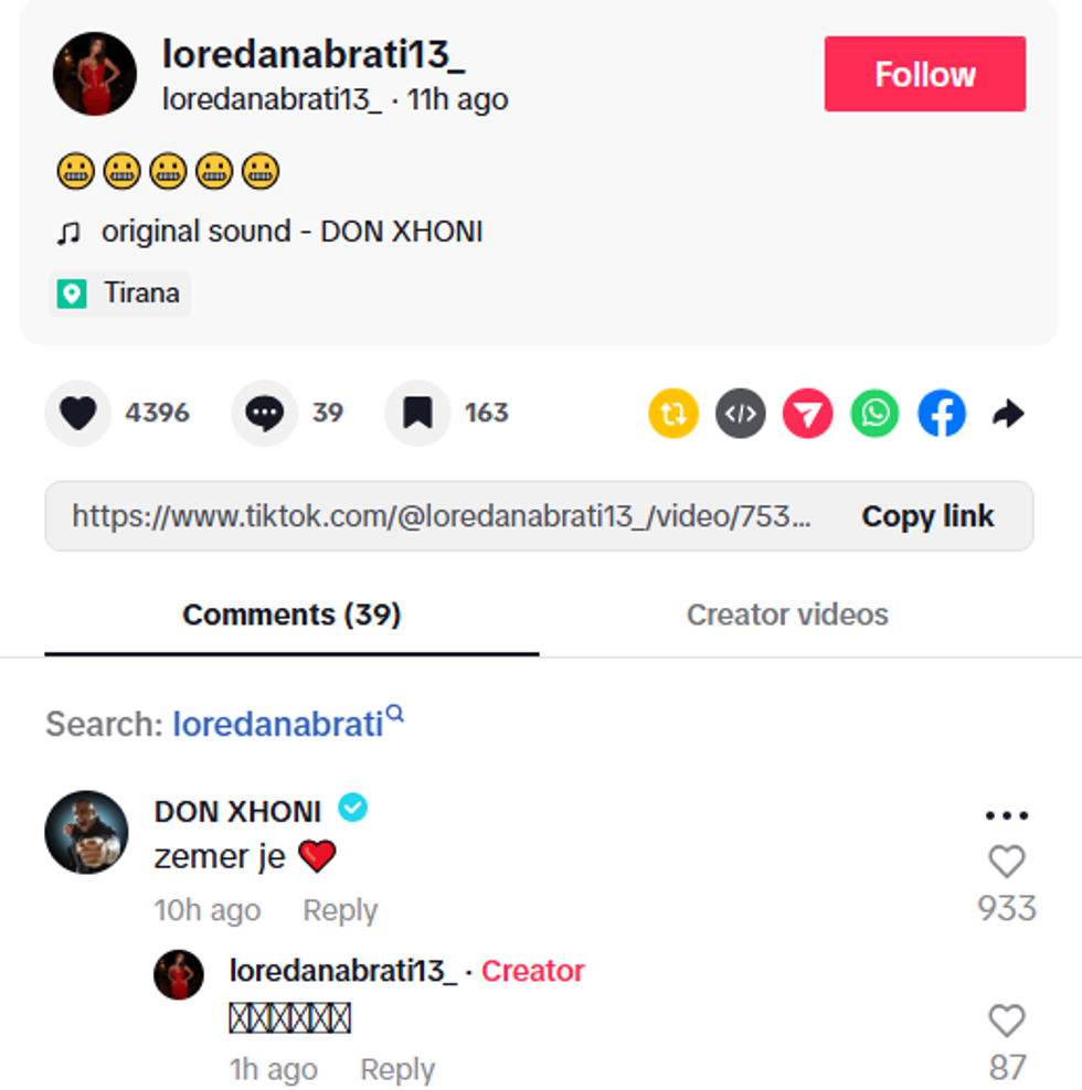 Kjo nuk është hera e parë që Loredana dhe Don Xhoni lidhen në mënyrë të tërthortë përmes rrjeteve sociale, duke krijuar interes të madh te publiku dhe ndjekësit e tyre të shumtë.