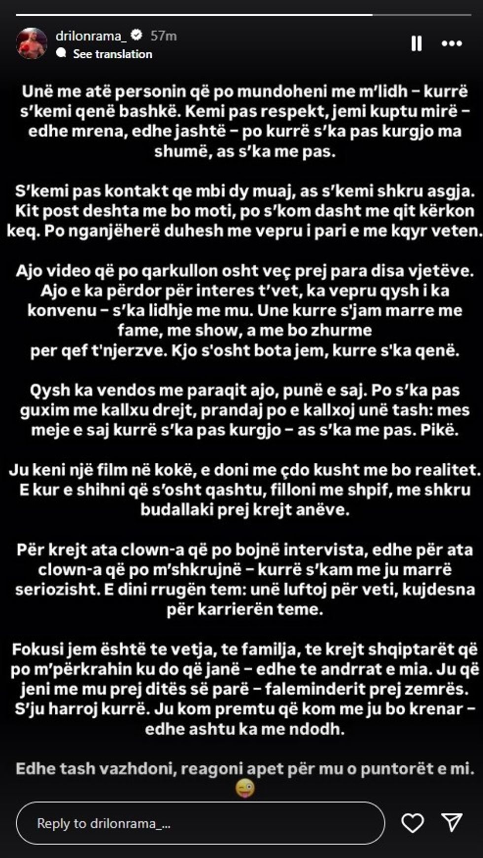 Në një shkrim të gjatë të publikuar në Instagram, Driloni ka ndarë versionin e tij, duke sqaruar se nuk ka asnjë lidhje me asnjë nga vajzat që janë përmendur në media, përfshirë edhe Sarën, me të cilën ishte përfolur më herët.