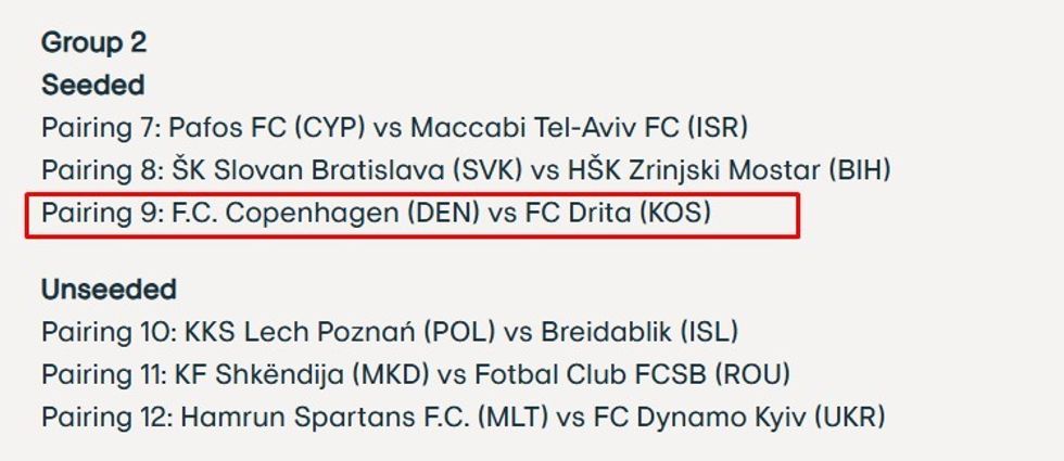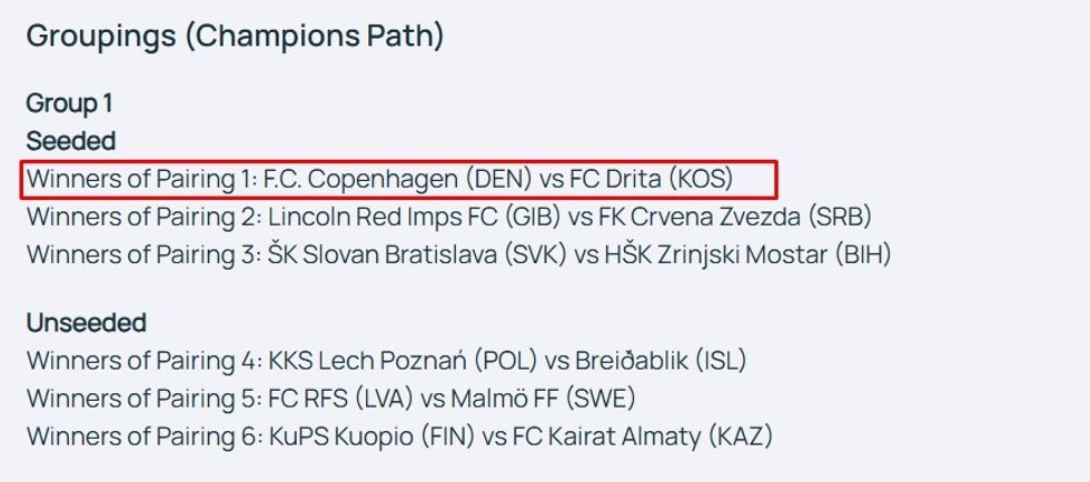 Drita ndodhet në Grupin A së bashku me skuadrën daneze dhe fituesi i këtij dueli do të kalojë në rrethin e tretë të Ligës së Kampionëve. Kundërshtarët e mundshëm në atë fazë janë fituesit e përballjeve: Lech Poznan – Breidablik, Riga – Malmö dhe KuPS – Kairat.