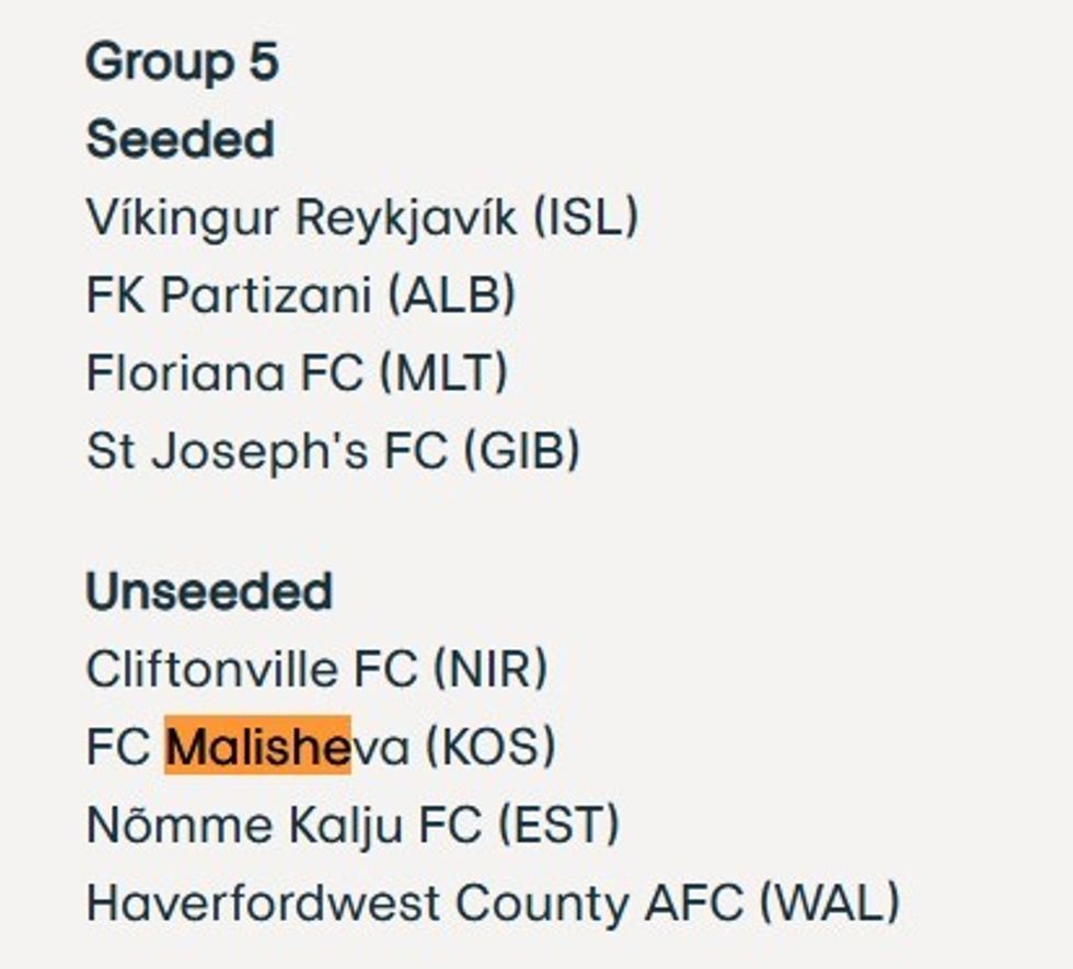 Në anën tjetër, Malisheva mund të ndeshet me ekipet si Vikingur Reykjavik nga Islanda, Partizani i Tiranës, Floriana FC nga Malta dhe St Joseph's FC i Gjibraltarit.