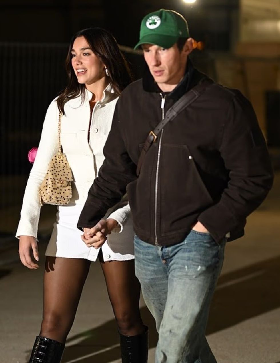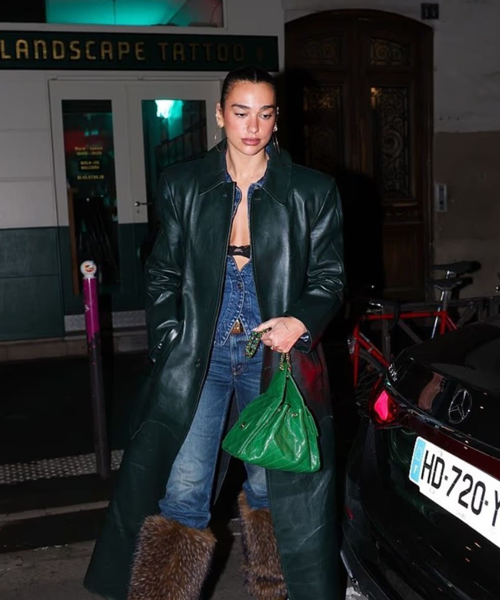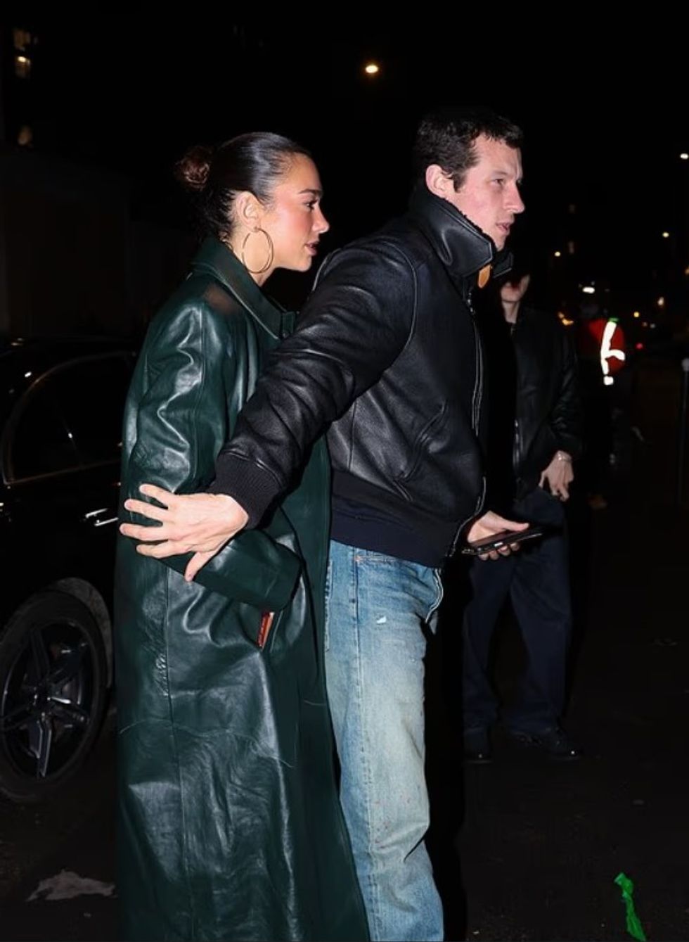 Pamjen e kompletoi me çizme të larta ngjyrë kafe me gëzof, një pallto të gjatë lëkure në ngjyrë jeshile të errët dhe një çantë Chanel, ndërsa Callum u shfaq më minimalist, me xhinse blu dhe një xhaketë bomber të zezë prej lëkure.