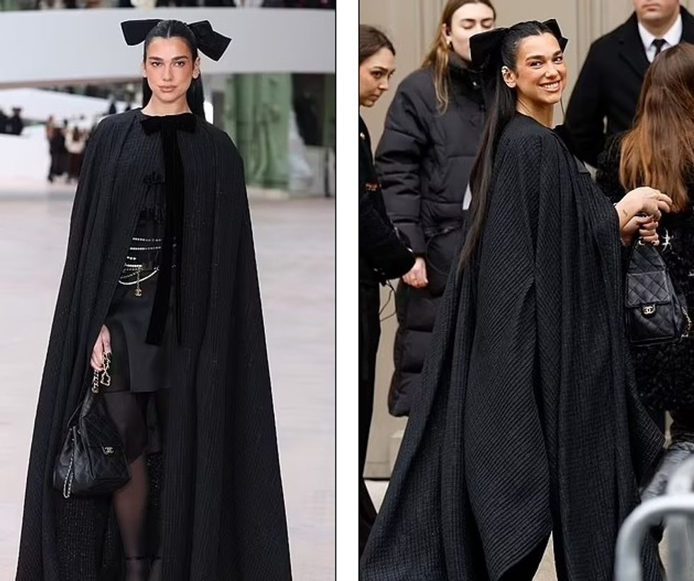 Dua Lipa hodhi pelerinën e saj dramatike të zezë deri në dysheme dhe bëri një ndryshim të shpejtë të veshjes teksa u largua nga sfilata e 'Chanel' në Javën e Modës në Paris.