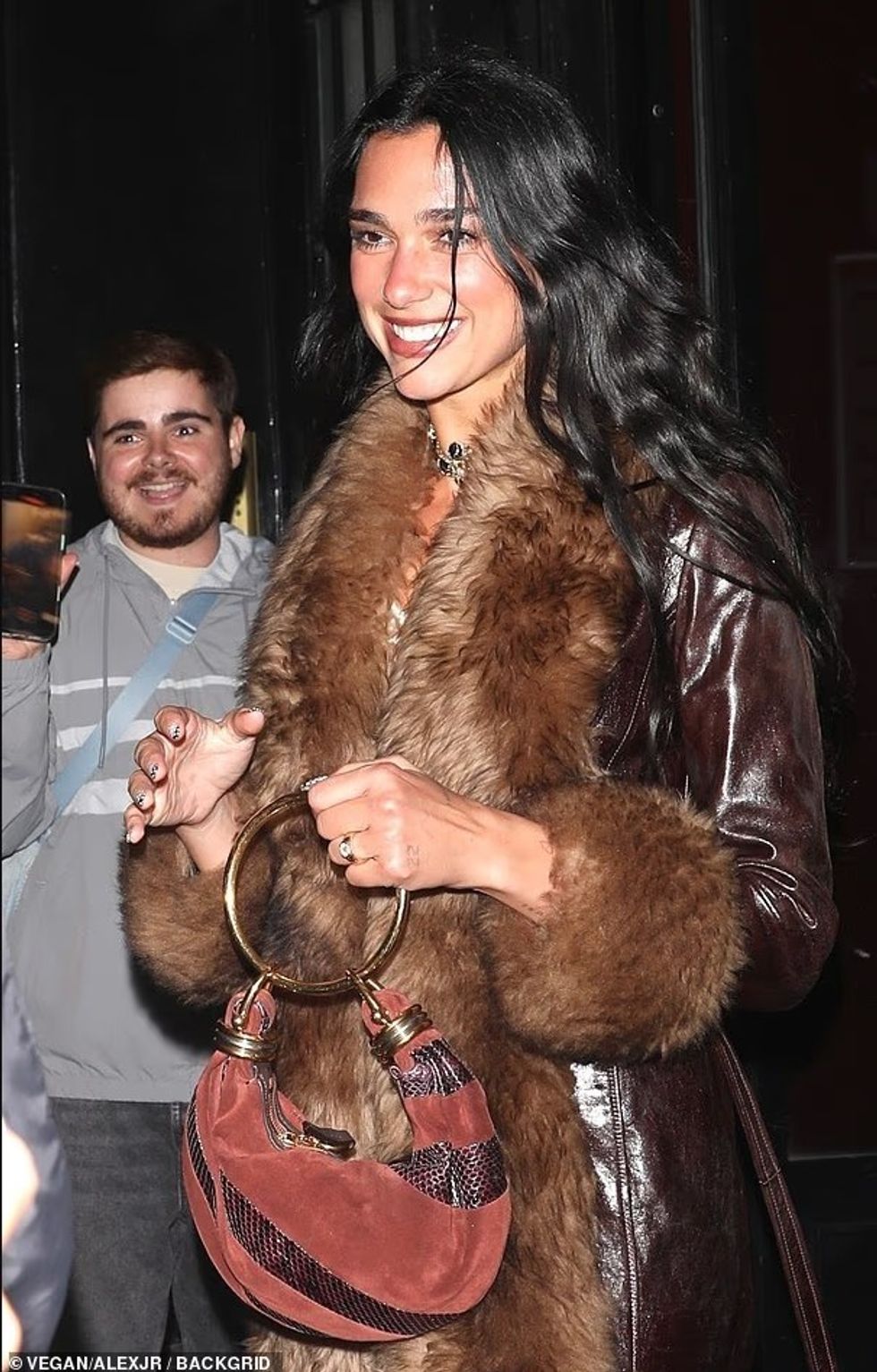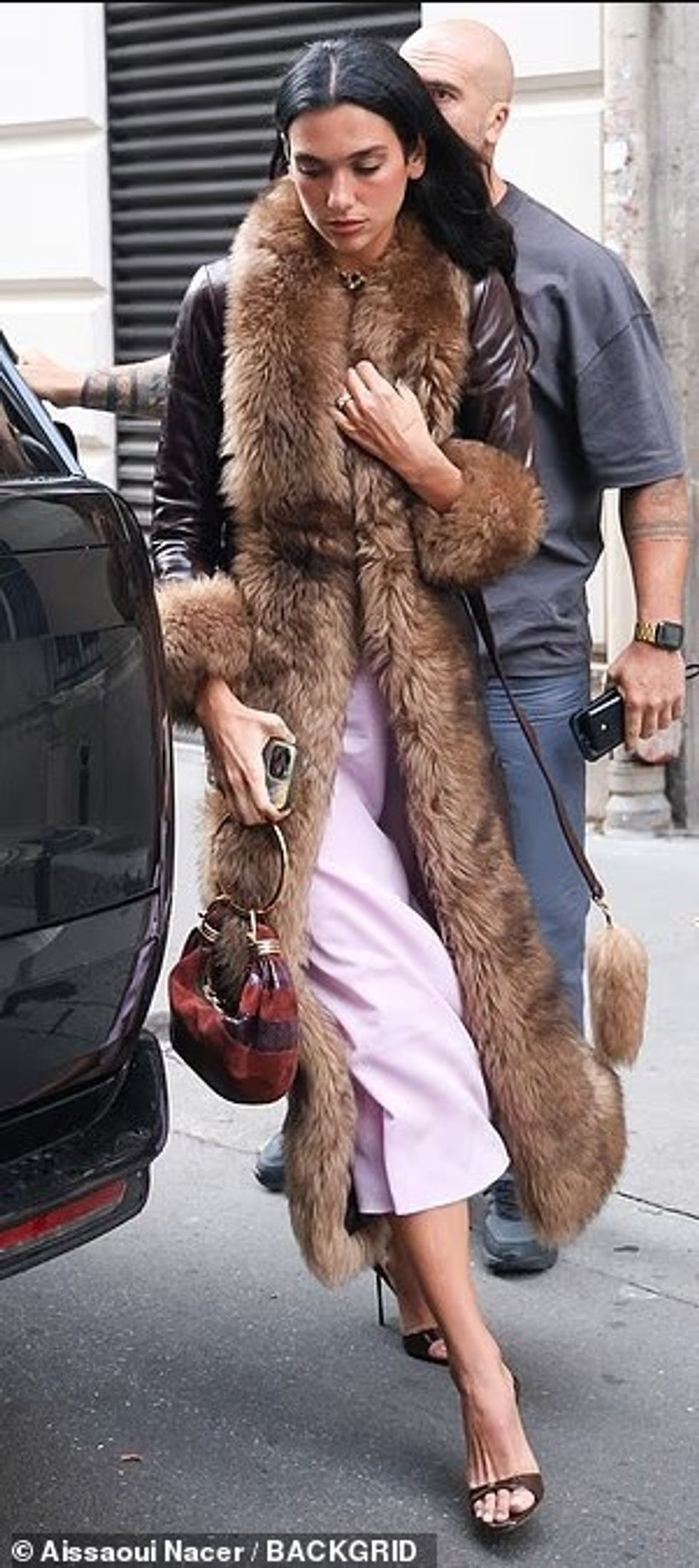 Ajo e kompletoi dukjen me një pallto të gjatë lëkure dhe një çantë të vogël luksoze, duke treguar një stil të rafinuar dhe modern.