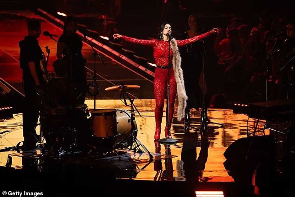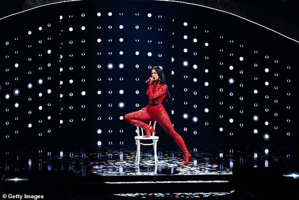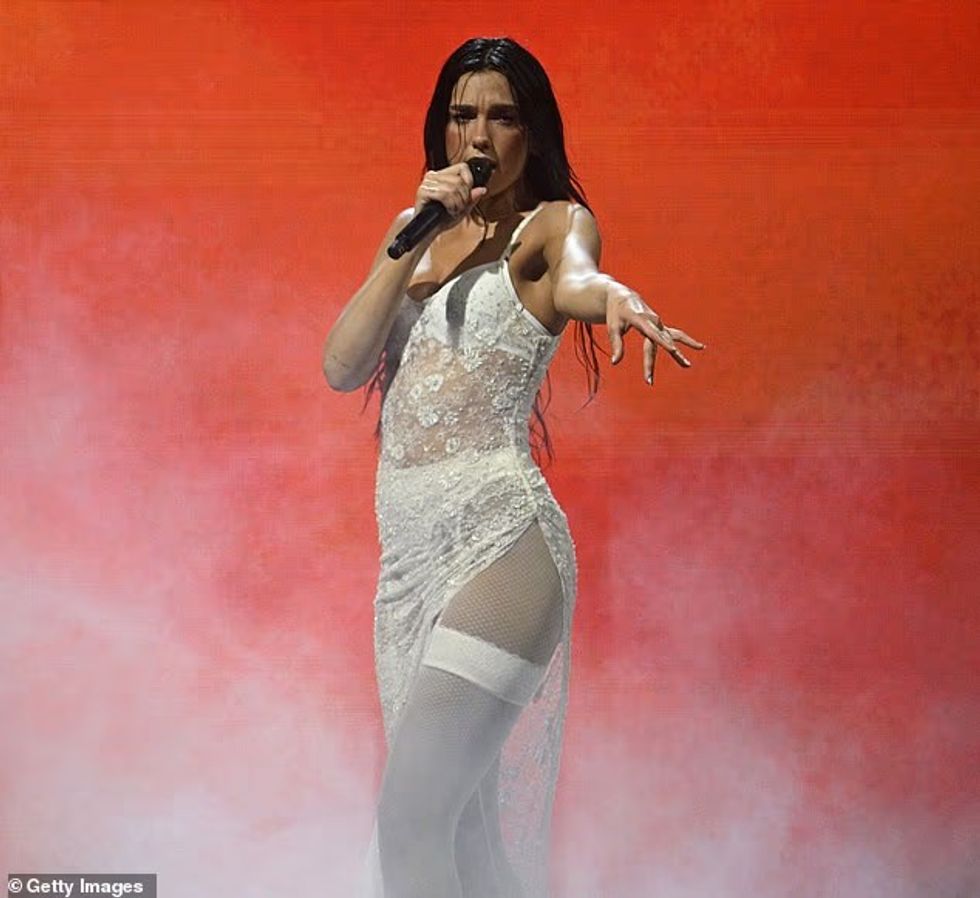 Në paraqitjen e saj të parë, Dua u shfaq me një bodysuit ngjyrë gri me korse, ku theksoi linjat dhe këmbët elegante, teksa interpretoi hitet “Levitating” dhe “Dance The Night”. Ajo e kompletoi dukjen me geta të zeza dhe çizme me shkëlqim, duke e dominuar skenën me vetëbesim.