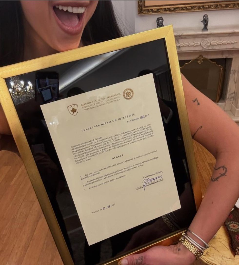 Presidentja e Kosovës, Vjosa Osmani, i dorëzoi këngëtares dokumentet zyrtare të shtetësisë në një ceremoni solemne të premten, duke e cilësuar atë si "një nga figurat më ikonike kulturore në historinë e vendit tonë".
