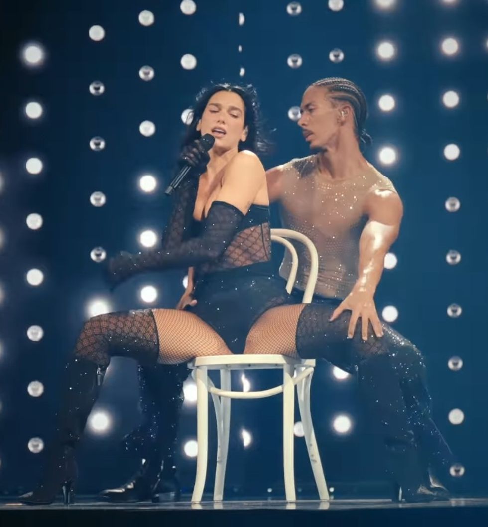 Në disa pamje, Dua Lipa ngjitet lart nga balerinët, ndërsa e këndon me pasion një prej këngëve të saj — një moment dramatik dhe sensual që ndali frymën e publikut.