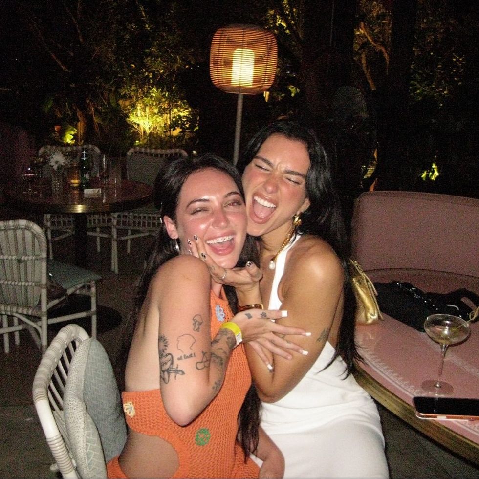 Në një tjetër imazh, Dua shfaqet në mesin e një grupi miqsh, të gjithë të buzëqeshur dhe duke festuar së bashku në atë që duket të jetë një darkë apo festë në ambient të hapur.