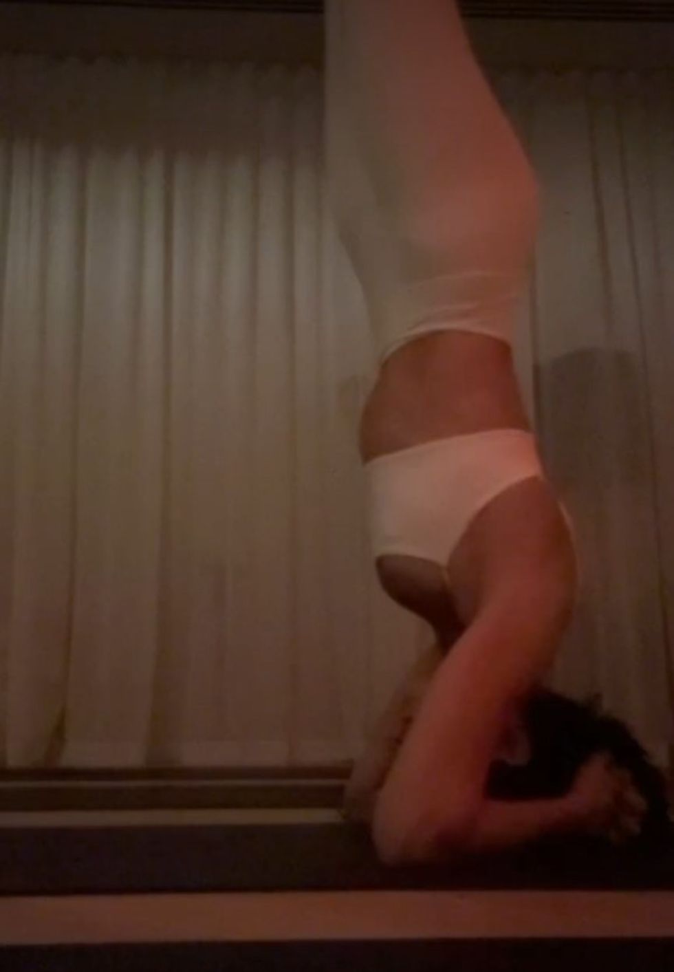 Ndërsa në një tjetër imazh, ajo tregon fleksibilitetin e saj të mahnitshëm, duke bërë një shtrirje të avancuar pranë një muri, e veshur me rroba sportive të bardha, ndërsa flokët e saj të gjatë bien lirshëm pas shpinës.