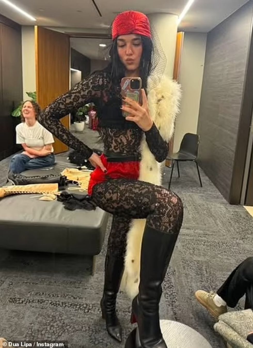 Në një tjetër foto, ajo pozonte para pasqyrës e veshur me një catsuit me dantella, ndërsa në një video tjetër shfaqej pas skenave gjatë një fotosesioni, e veshur me një kostum të kuq tërheqës.