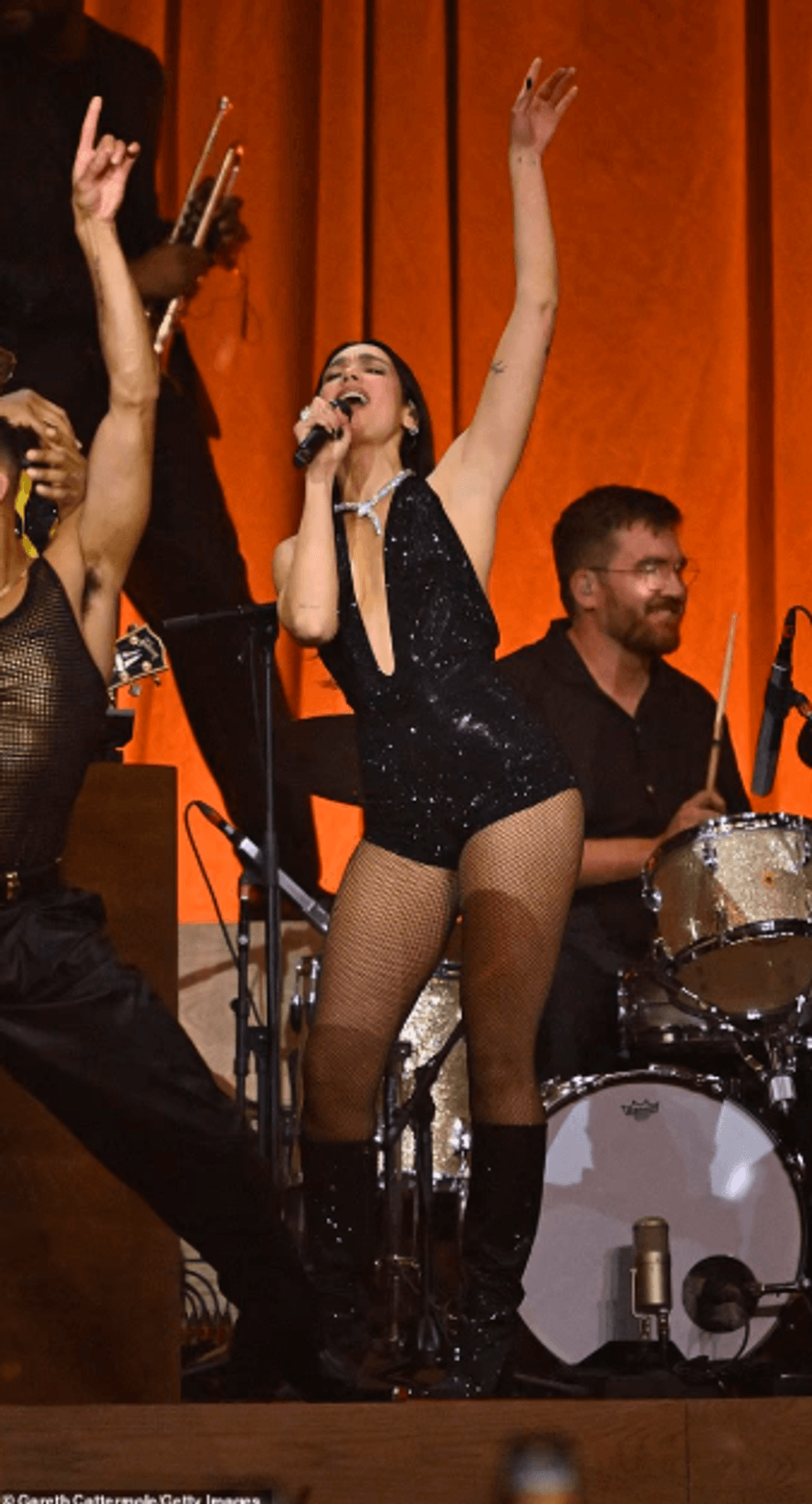 Ylli i muzikës u bashkua me Mark Ronson gjatë interpretimit të tij të medley-t të hiteve, duke kënduar këngën e saj të njohur “Dance the Night” ndërsa binte nga lart në një top diskodishe masiv, një moment që u konsiderua si një nga momentet më të mahnitshme të mbrëmjes.
