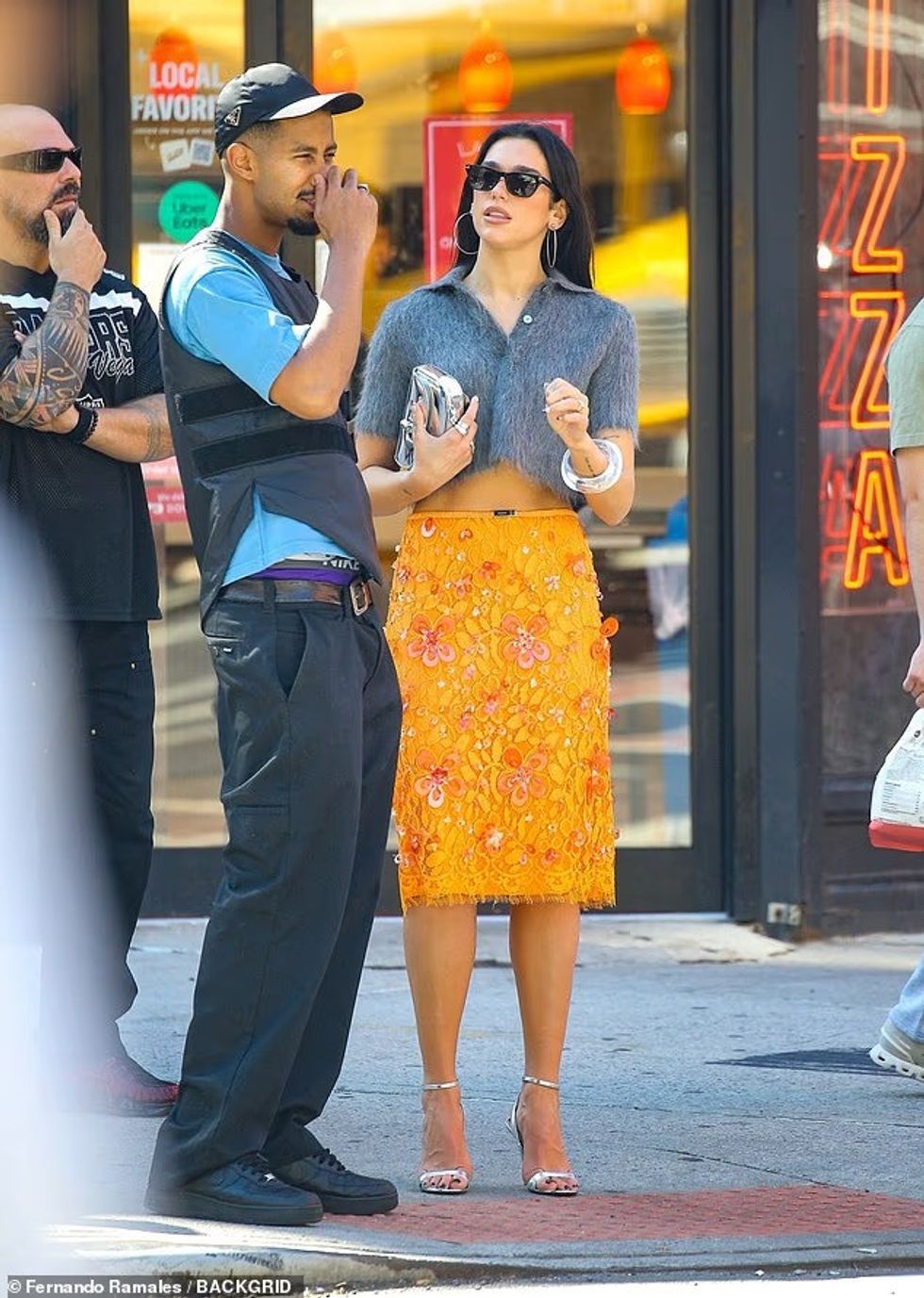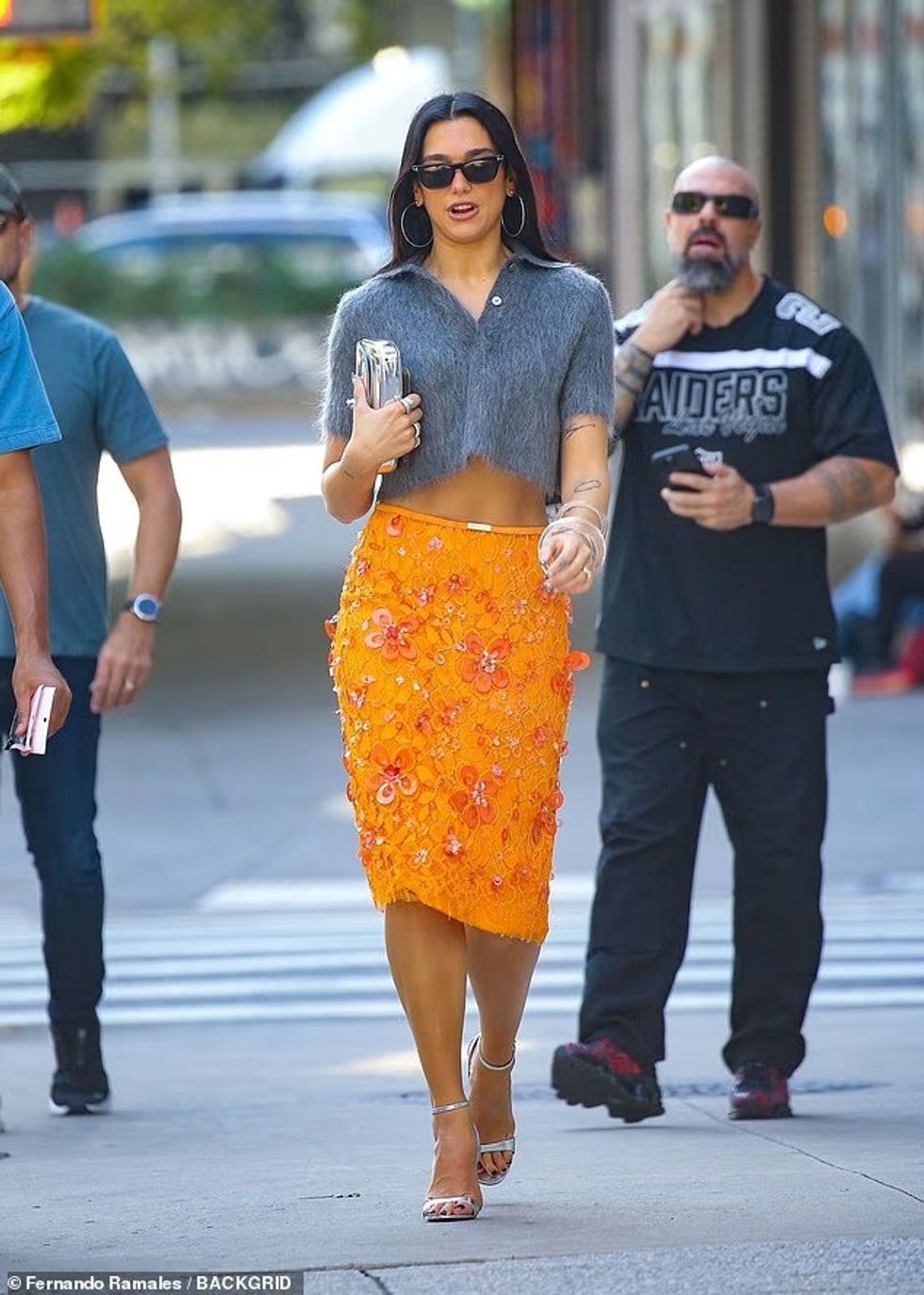 Dua Lipa u shfaq me një paraqitje shumëngjyrëshe teksa shëtiste nëpër New York të enjten, e veshur me një fund të gjatë portokalli nga Gucci.