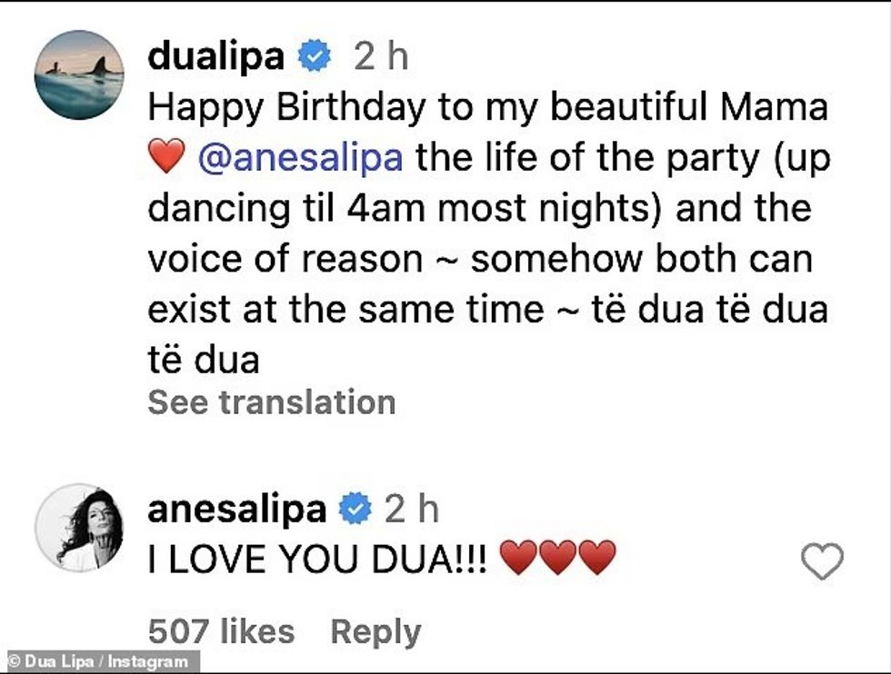 Në mbishkrimin që shoqëronte postimin, Dua shkroi me përzemërsi: “Gëzuar ditëlindjen mamasë sime të bukur @anesalipa. Jeta e festës (duke kërcyer zgjuar deri në orën 4 të mëngjesit shumicën e netëve) dhe zëri i arsyes, në një farë mënyre të dyja mund të ekzistojnë në të njëjtën kohë, të dua, të dua, të dua”.