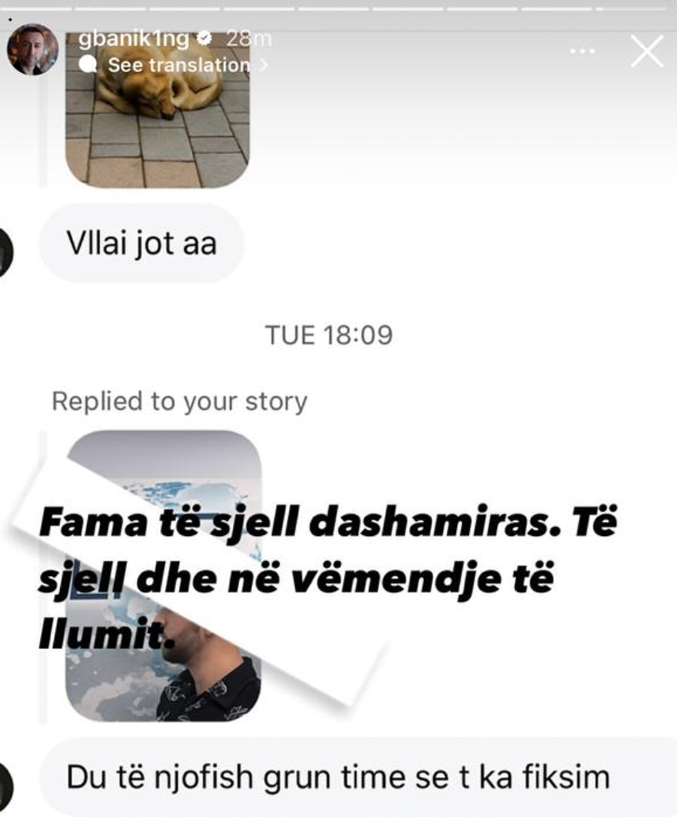 Përmes një postimi në InstaStory, ai publikoi një mesazh privat që kishte marrë nga një ndjekës.