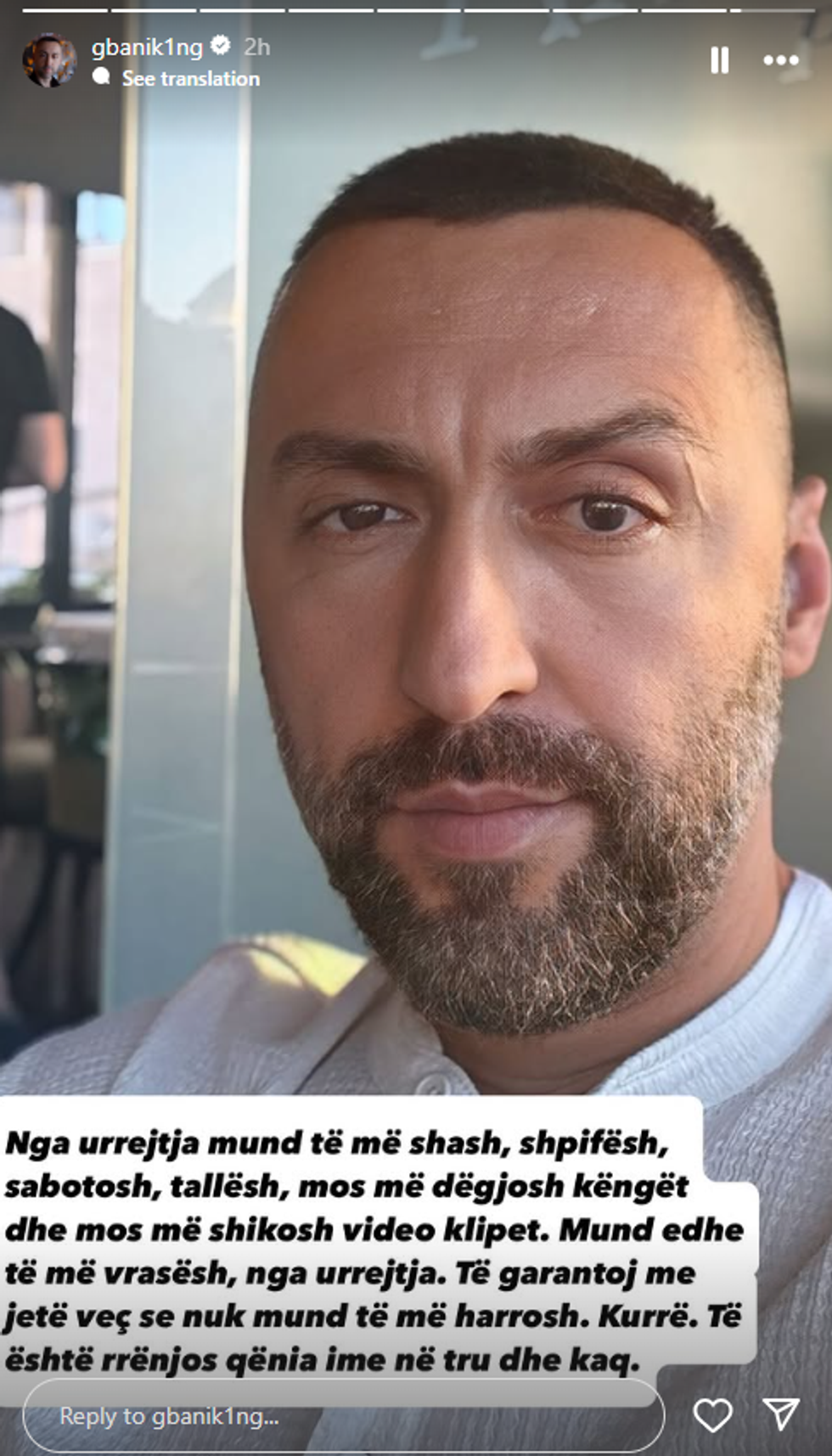 Ndërkohë, G Bani vazhdon të jetë aktiv në muzikë dhe në komunikimin me ndjekësit e tij, duke mos u stepur për të reaguar sa herë që ndjen se është e nevojshme të vendosë kufijtë e duhur në raport me publikun. /Telegrafi/