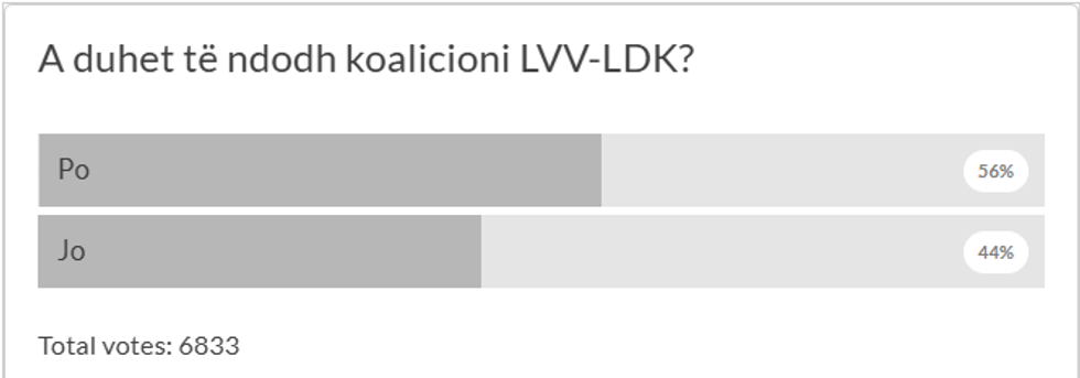 Telegrafi ka hapur një sondazh për lexuesit ku i ka pyetur nëse duhet të ndodh një koalicion mes LVV-LDK. Në këtë sondazh mendimin e tyre e kanë shprehur 6 mijë e 833 lexues në më pak se 24 orë, prej tyre 56% hanë deklaruar se po duhet të ketë koalicion LVV-LDK, ndërsa 44% kanë thënë që jo.