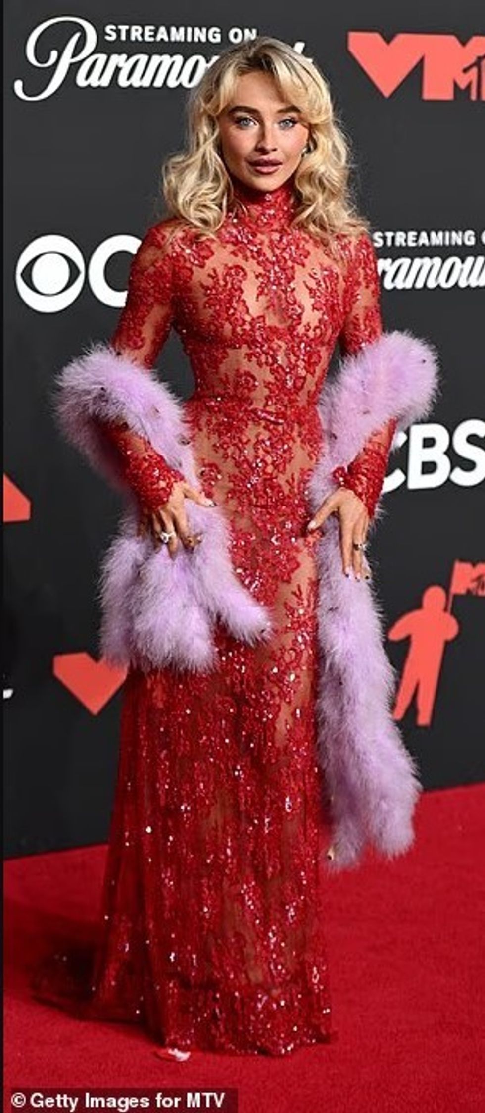 Sabrina Carpenter, 26 vjeçe, shkëlqeu me një fustan elegant Valentino në ngjyrë të kuqe me dantellë dhe shkëlqim, të kombinuar me një shall të gjatë me pupla livandoje.