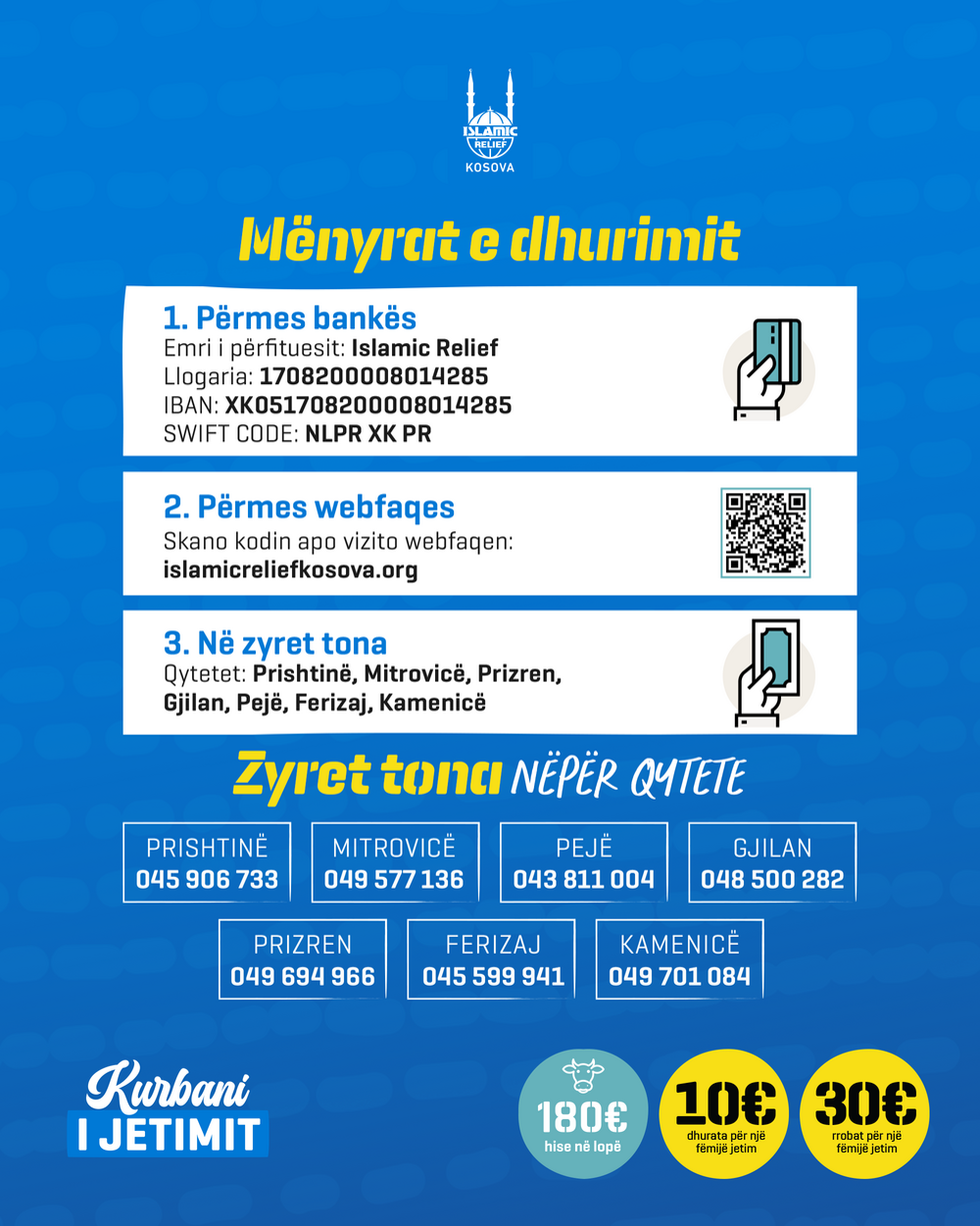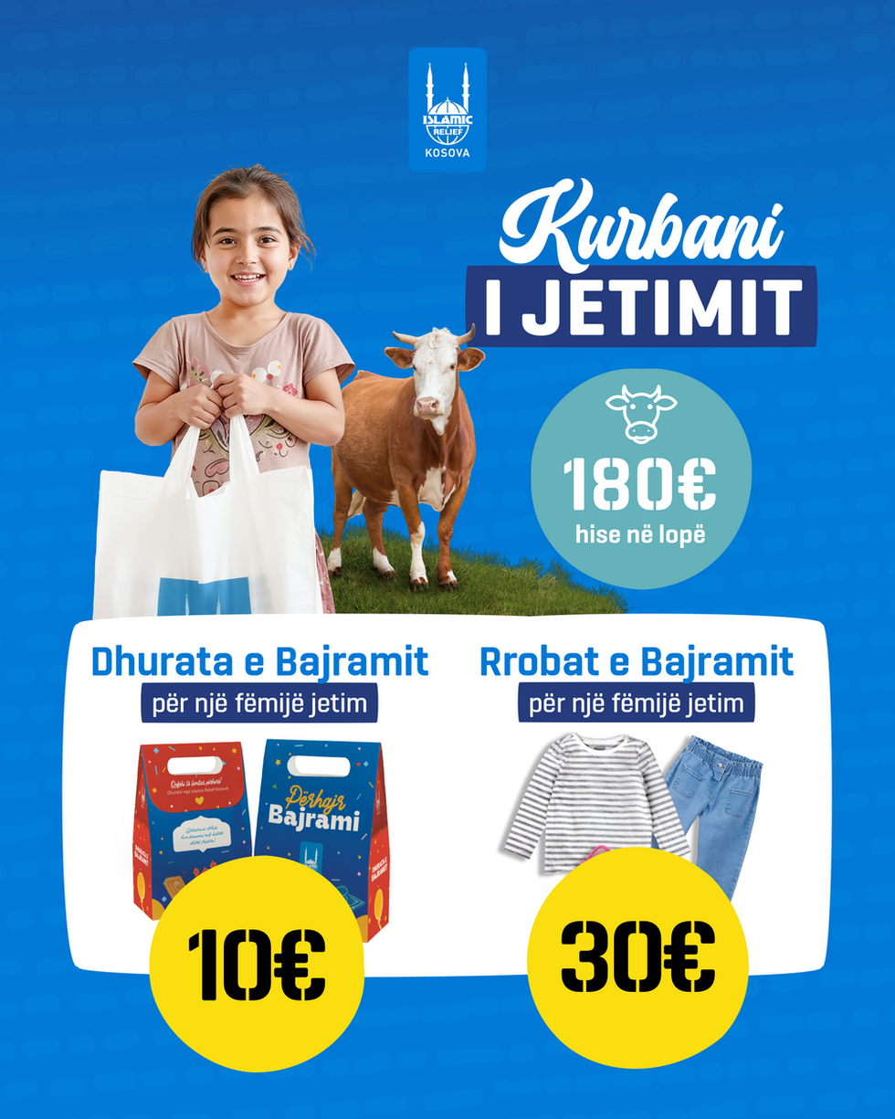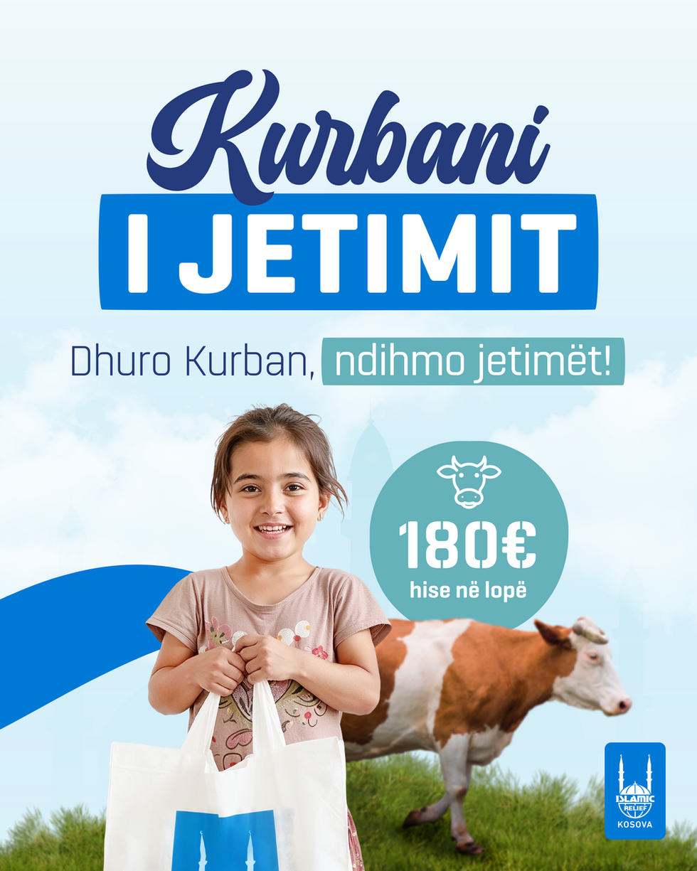 Duke therur kurbanin në Islamic Relief (me çmim prej 180€ për hise në lopë), ju njëkohësisht ndihmoni edhe familjet me fëmijë jetimë dhe familjet tjera në kushte të vështira jetësore, pasi mishi i kurbanit iu shpërndahet atyre, në mënyrë që edhe ata të kenë arsye për të festuar.
