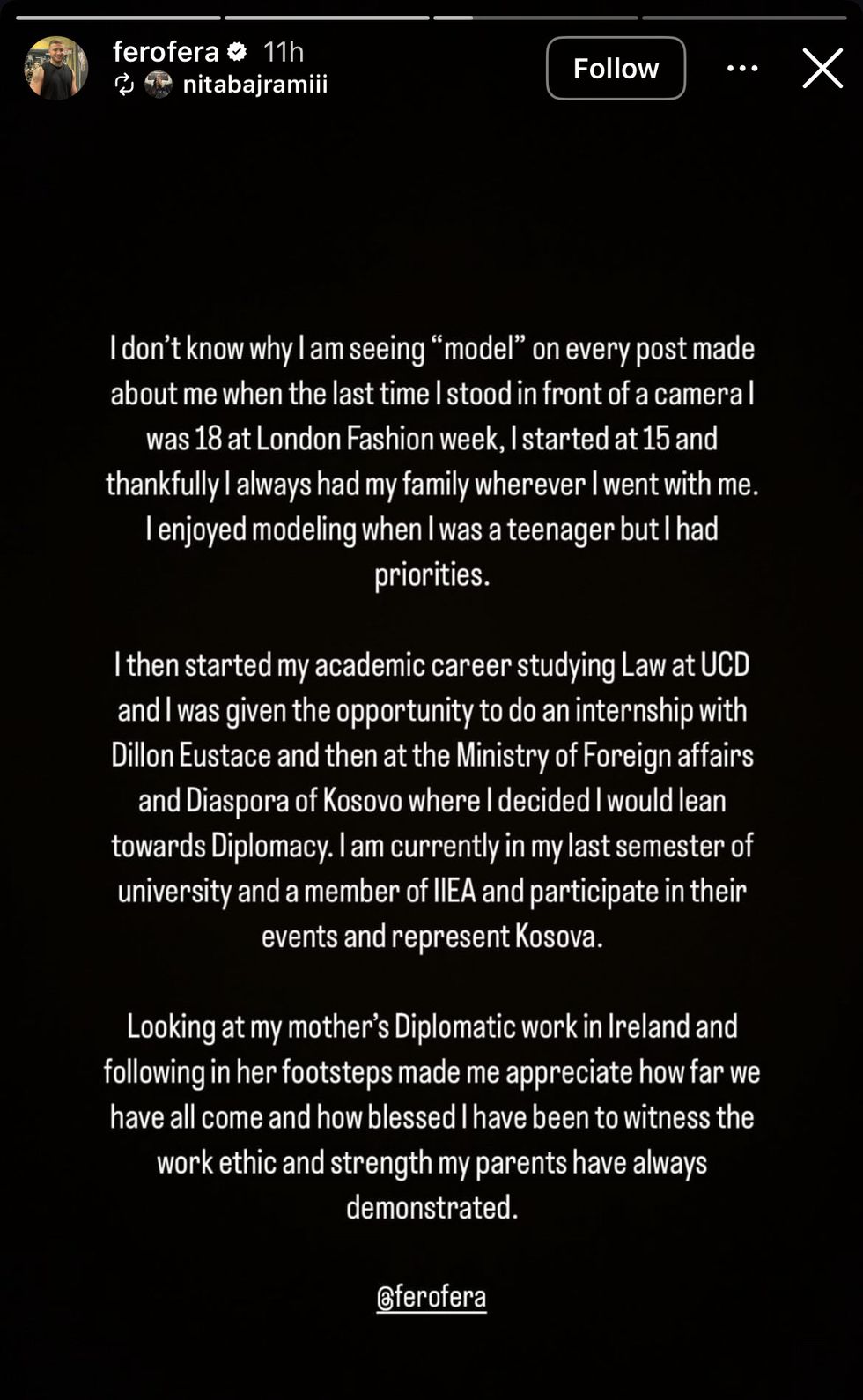 "Nuk e di pse po shoh 'modele' në çdo postim të bërë për mua, kur hera e fundit që qëndrova para një kamere isha 18 vjeçe në London Fashion Week, e nisa si 15 vjeçe dhe fatmirësisht e kisha gjithmonë familjen time kudo që shkoja me vete", ka shkruar Nita në një reagim të saj në rrjetet sociale.