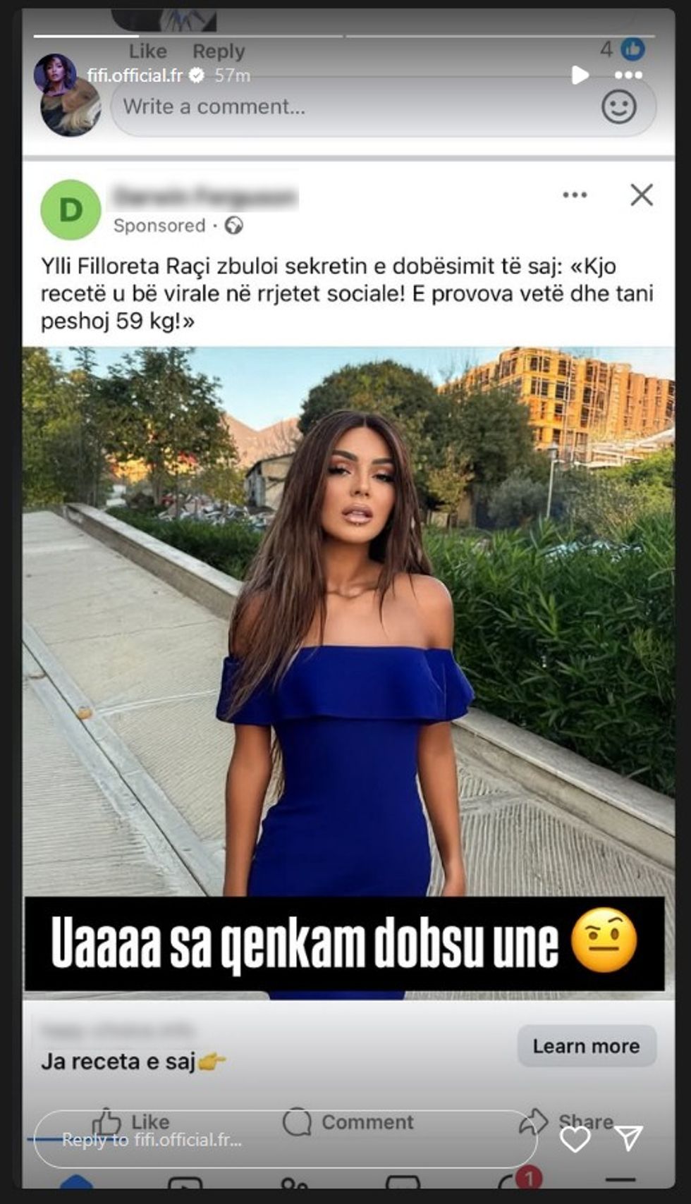 Fifi gjithashtu publikoi fotot origjinale në Instagram për të vërtetuar se reklama ishte manipulim i pastër dhe një tentativë për të mashtruar publikun në emër të saj.