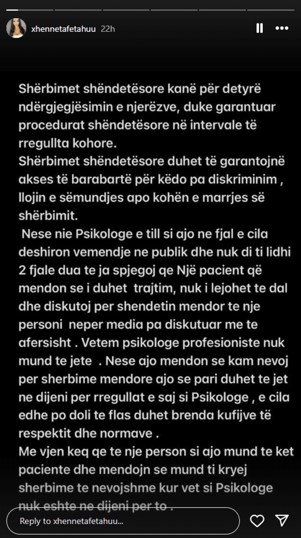 Psikologia nga ana tjetër ia bëri të ditur se nuk ka thënë në asnjë moment që ka probleme mendore dhe se është keqkuptuar.