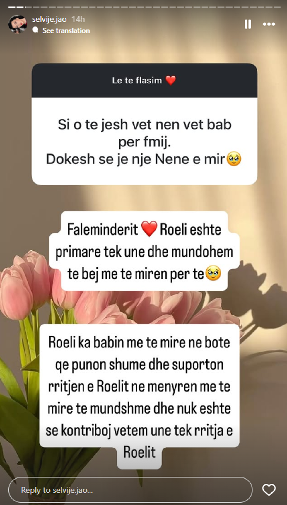 “Roeli ka babanë më të mirë në botë, që punon shumë dhe mbështet rritjen e tij në mënyrën më të mirë të mundshme. Nuk është se kontribuoj vetëm unë në rritjen e Roelit”, tha Selvije.