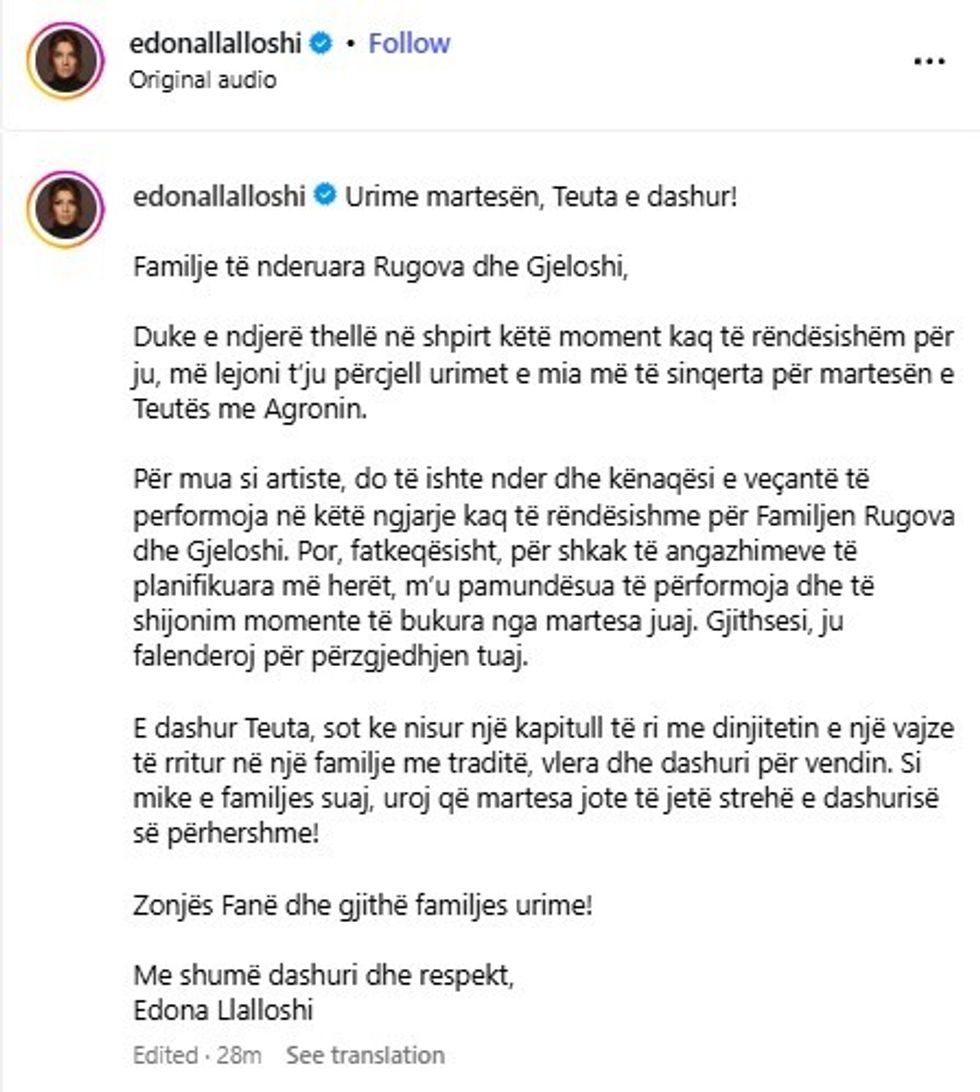 Por, fatkeqësisht, për shkak të angazhimeve të planifikuara më herët, m’u pamundësua të performoja dhe të shijonim momente të bukura nga martesa juaj. Gjithsesi, ju falenderoj për përzgjedhjen tuaj”, vazhdoi ajo.