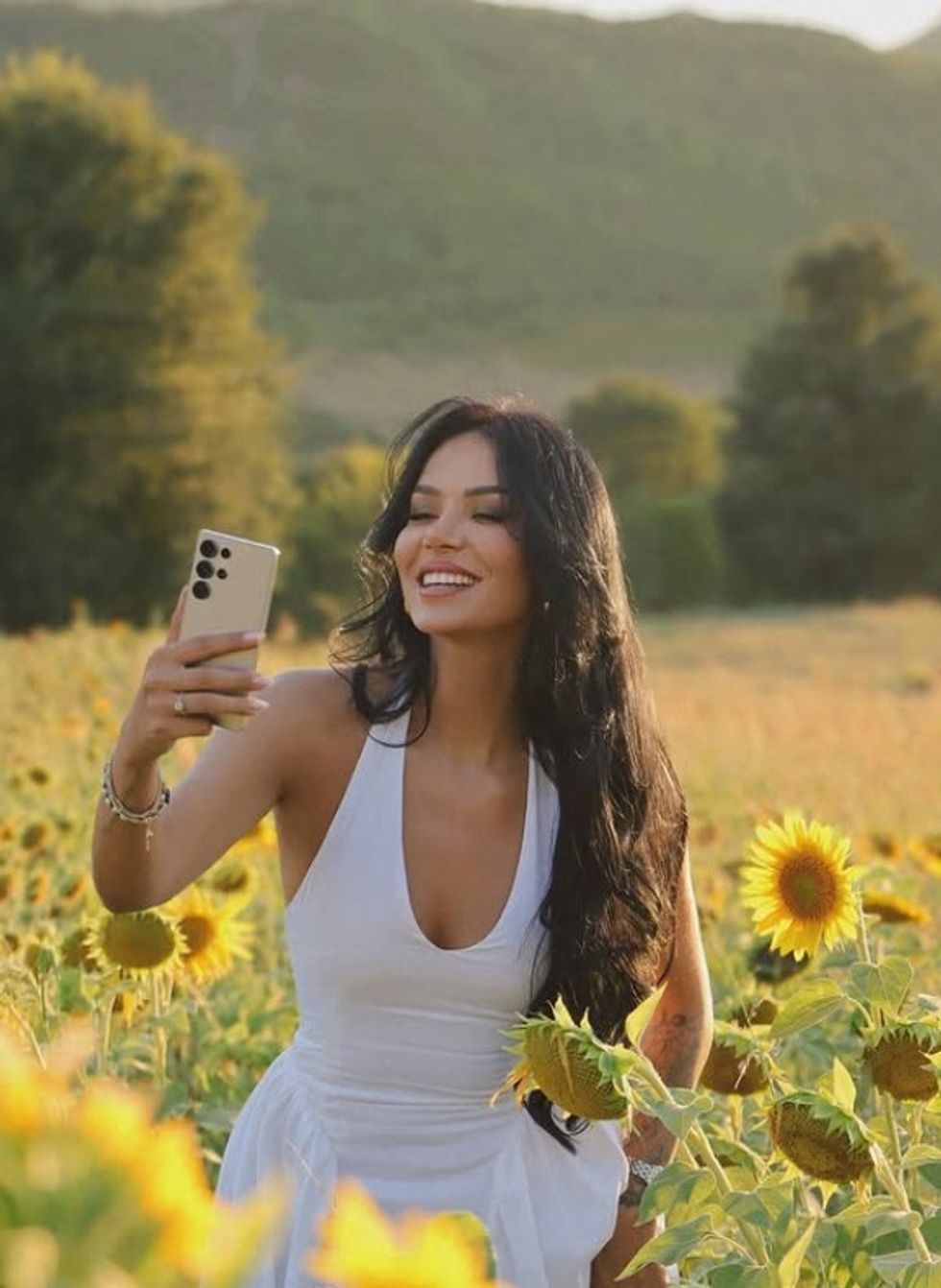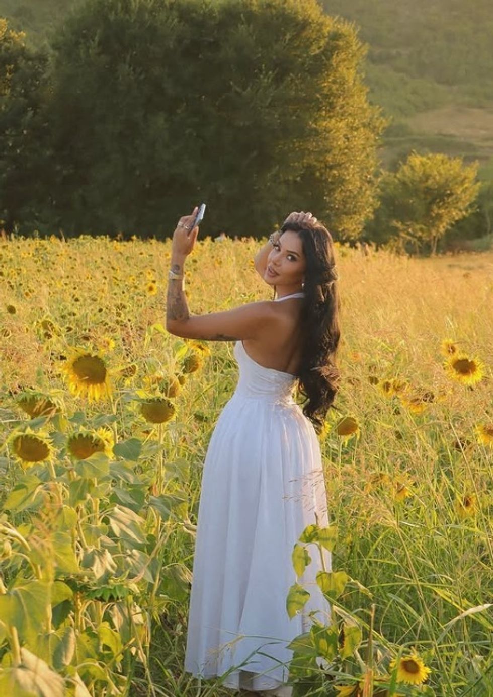 Në imazhet e publikuara, ajo shihet e veshur me një fustan të bardhë të gjatë, ndërsa pozon në një fushë të mbushur me lulediellë, duke dhënë ndjesinë e një skene të marrë nga një film.