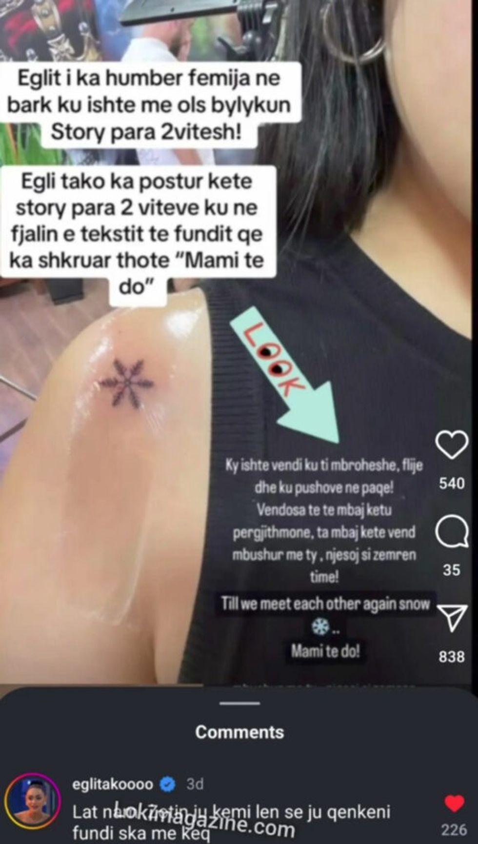 Në postimin e saj, Egli shkruante: “Ky ishte vendi ku ti mbroheshe, flije dhe ku pushove në paqe! Vendosa të të mbaj këtu përgjithmonë, ta mbaj këtë vend mbushur me ty, njësoj si zemrën time! Till we meet each other again snow. Mami të do!” Ky mesazh i ngarkuar emocionalisht ka ngritur dyshime dhe ka bërë që disa individë të spekulonin se ai mund të ishte një aludim për një humbje fëmijësh të mundshme.