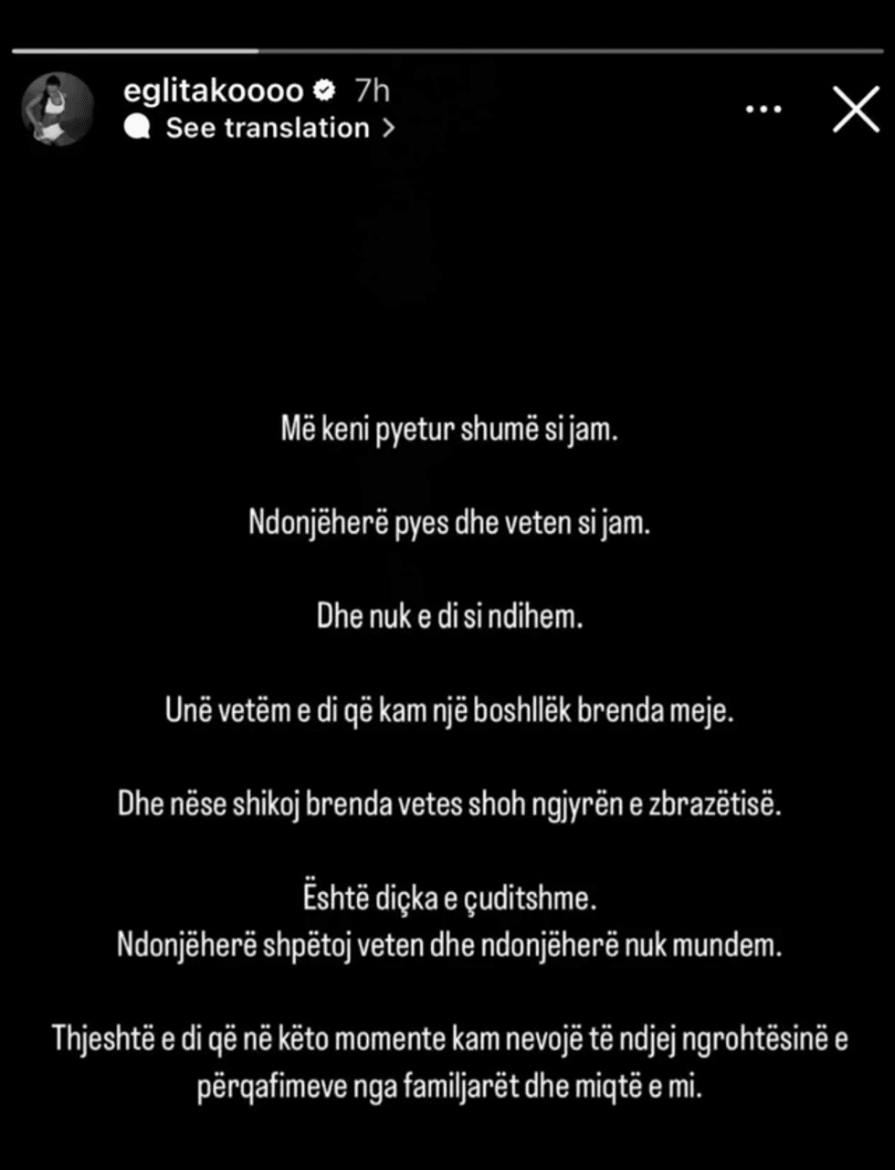 "Më keni pyetur shumë si jam. Ndonjëherë pyes dhe veten si jam. Dhe nuk e di si ndihem. Unë vetëm e di që kam një boshllëk brenda meje. Dhe nëse shikoj brenda vetes, shoh ngjyrën e zbrazëtisë. Është diçka e çuditshme. Ndonjëherë shpëtoj veten dhe ndonjëherë nuk mundem. Thjesht e di që në këto momente kam nevojë të ndjej ngrohtësinë e përqafimeve nga familjarët dhe miqtë e mi", ka shkruar ajo.