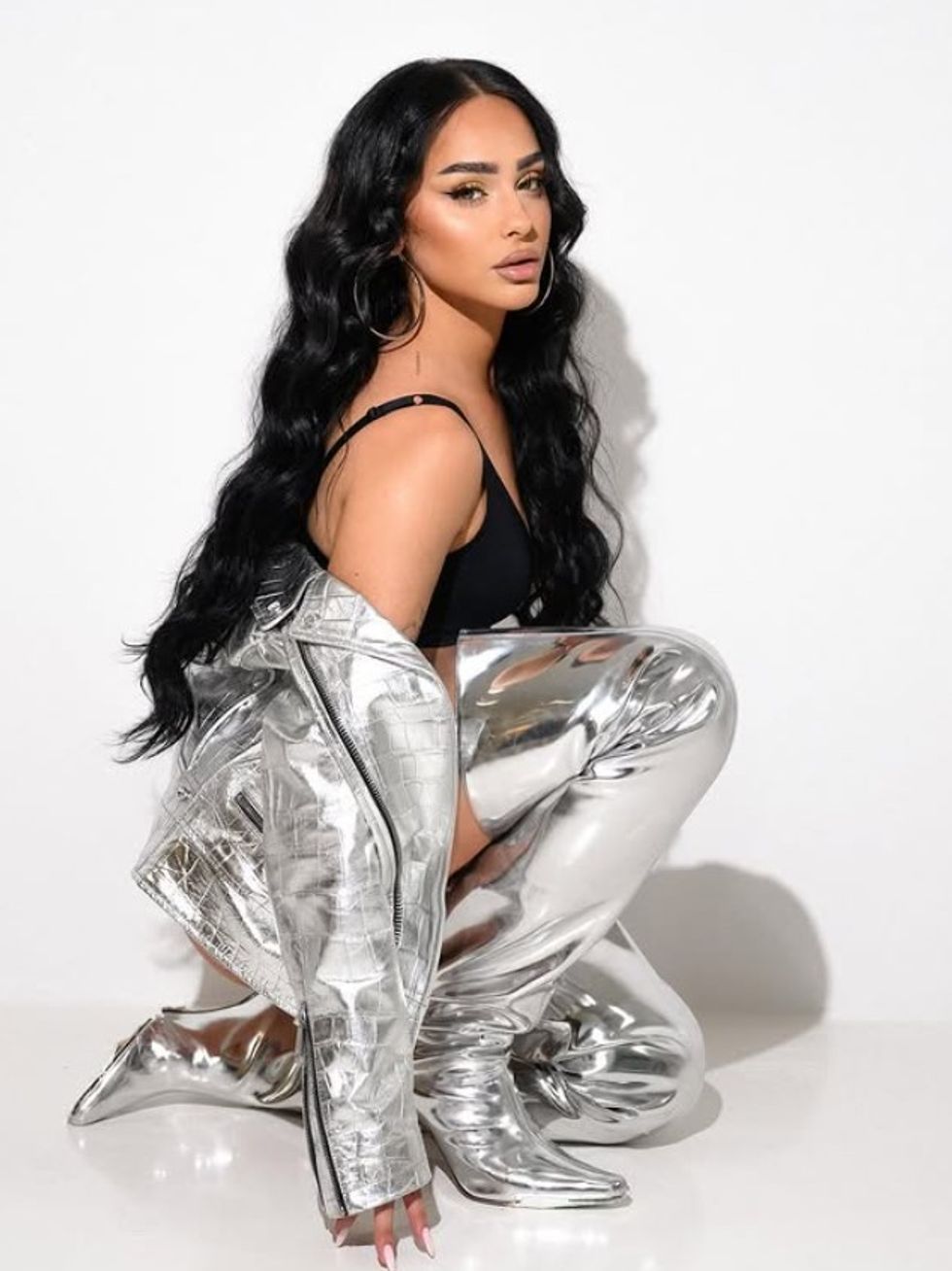 Me një kombinim të stilit urban dhe glam, Egli shfaqet me një veshje të zezë minimaliste, xhaketë dhe çizme metalike argjendi që krijojnë një kontrast të guximshëm.