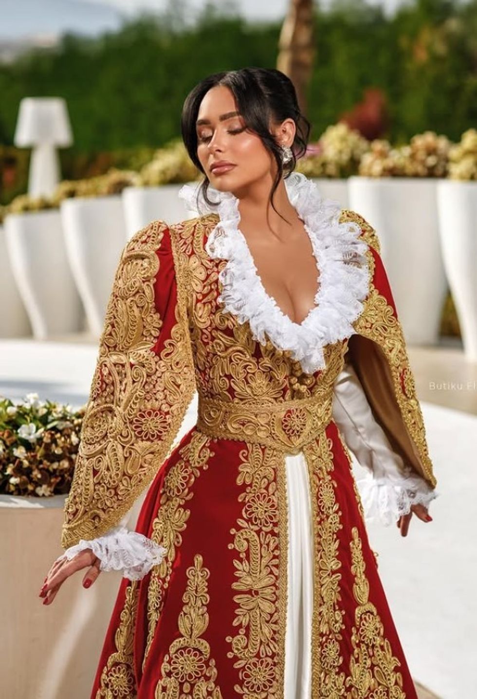Në njërën prej pamjeve, ajo vishet me një fustan të kuq të zbukuruar me qëndisje floriri dhe dantellë të bardhë, që i jep një pamje të sofistikuar.