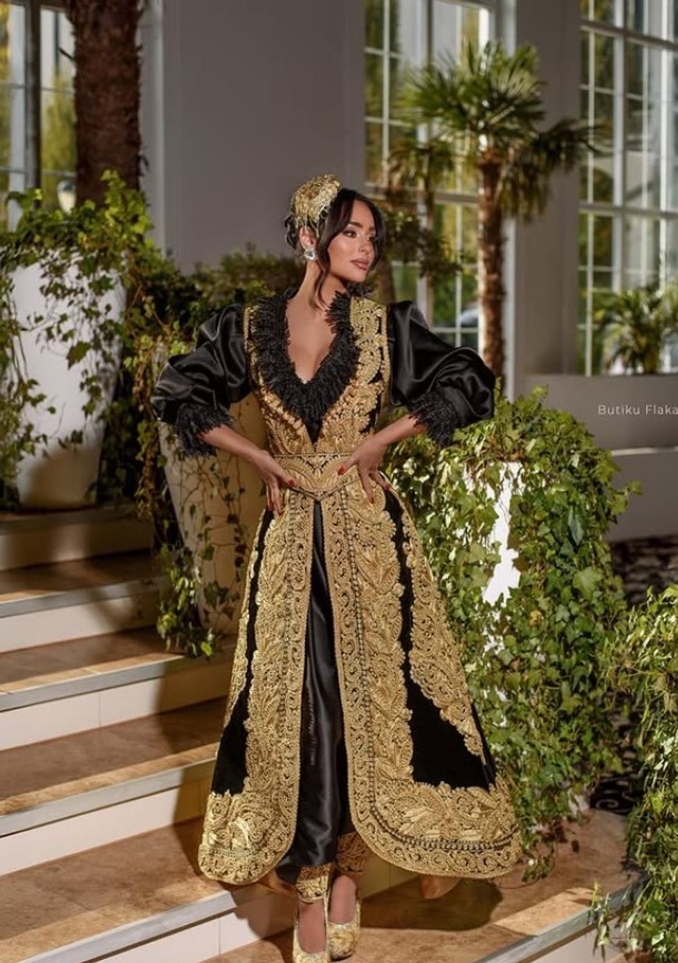 Në një tjetër paraqitje, ajo mahnit me një fustan të zi luksoz me detaje të arta, ndërsa mbyll serinë me një veshje të bardhë prej dantelle, të kombinuar me jelek të punuar me dorë.