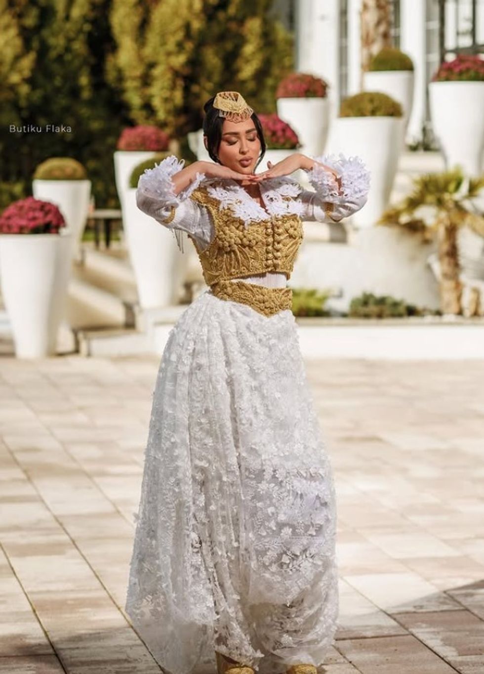 Në postimin e saj të fundit, Egli shfaqet me tri veshje të ndryshme, secila më elegante dhe më simbolike se tjetra, duke i dhënë një frymë moderne trashëgimisë kulturore.