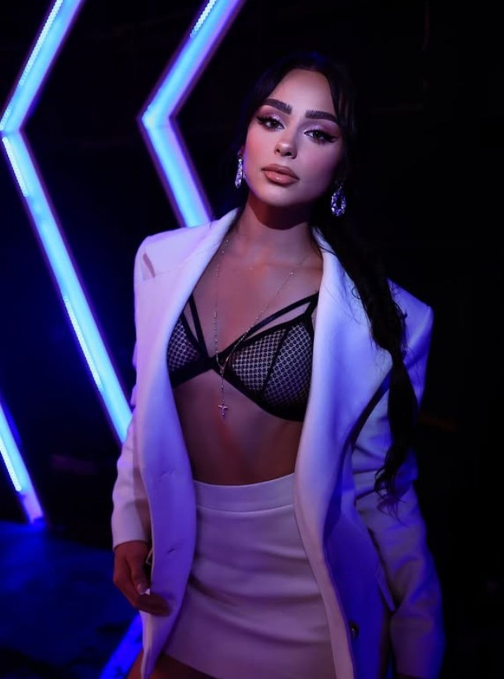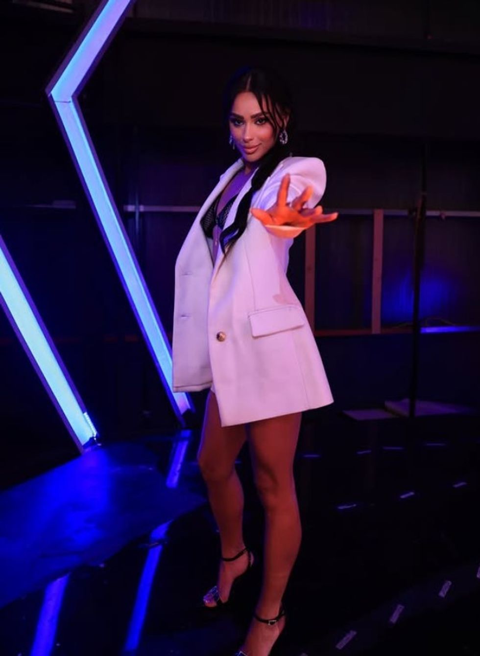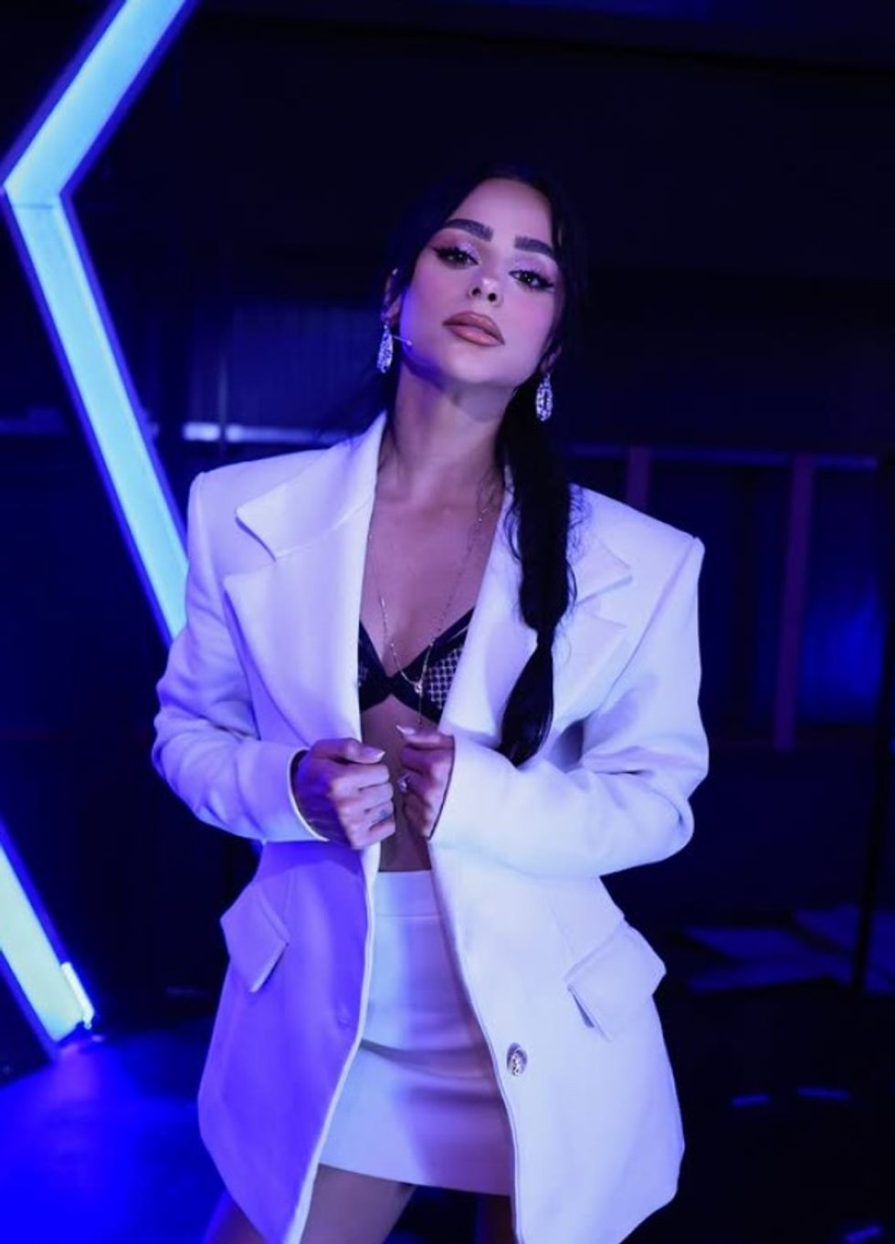 E veshur me një kostum të bardhë elegant, të kombinuar me një fustan mini dhe një palë sytjena të zeza rrjete, Egli solli një pamje plot stil dhe vetëbesim.