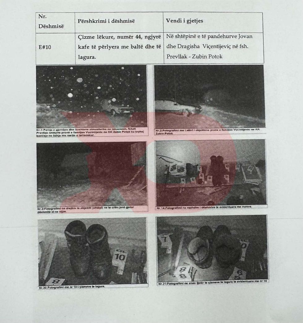 “Dheu i çizmeve të sekuestruara në shtëpinë e vëllezërve Viçenjtijeviç dhe ajo në fshatin Përvlak të kësaj komune më datë 30.11.2024 së bashku me mostrat referente të dheut të siguruara nga ekspertët policor të Kosovës dhe “FBI” të marra në vendin e ngjarjes…Nga mostrat qartazi vërehet se në mes të dheut të marrë në çizmet e të pandehurve Jovan dhe Dragisha Viçentijeviç dhe mostrave të dheut të marra në vendin e ngjarjes, më konkretisht në kanalin “Ibër Lepenc” nuk ka dallueshmëri, … çka vërtetohet se të pandehurit kanë kryhet aktin terrorist.” – thuhet në aktakuzën e Prokurorisë Speciale.